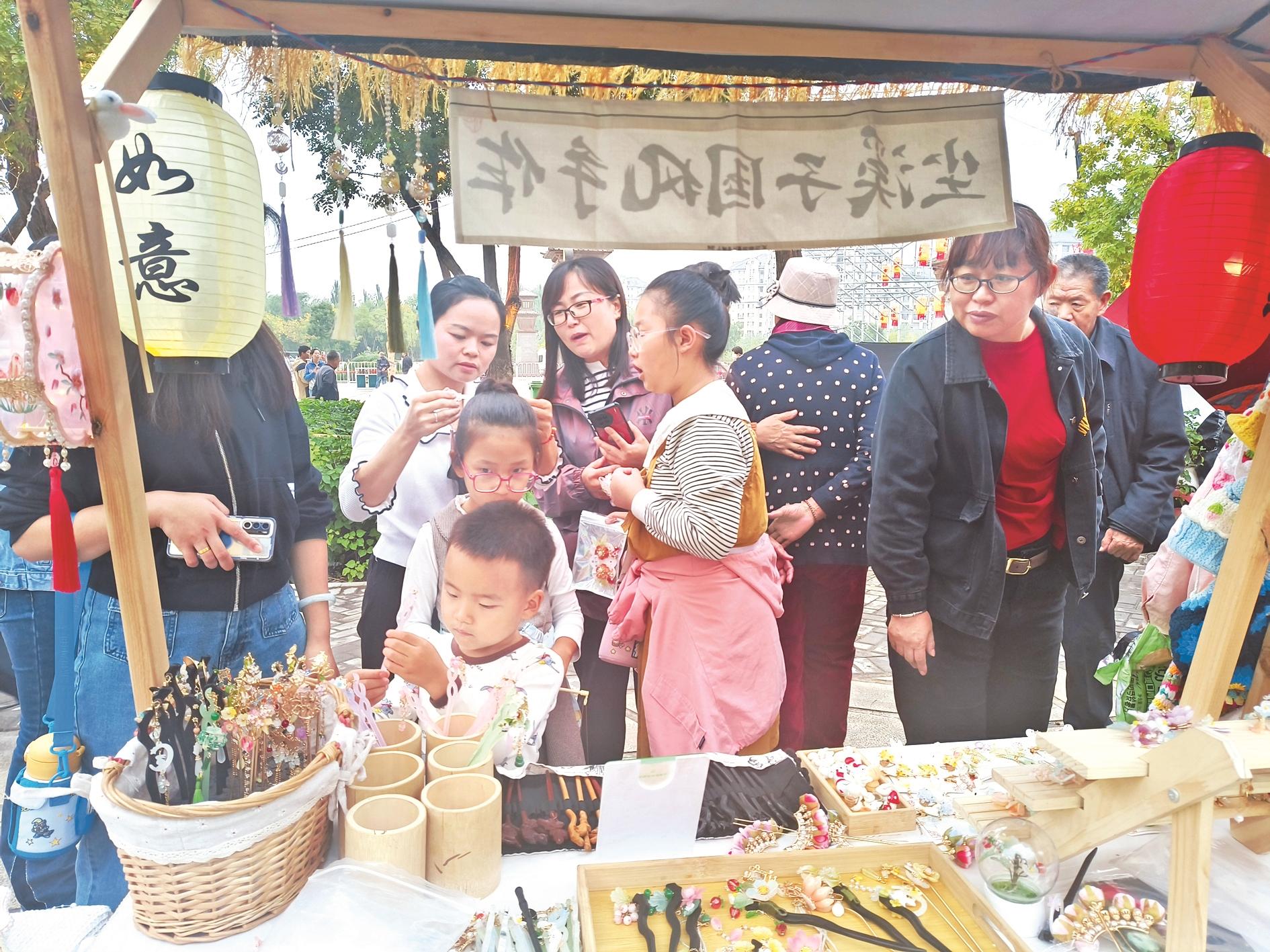 “国风集市”之月华星辉趣味游园活动现场,人们纷纷被手工制品吸引。 (郭威 摄)