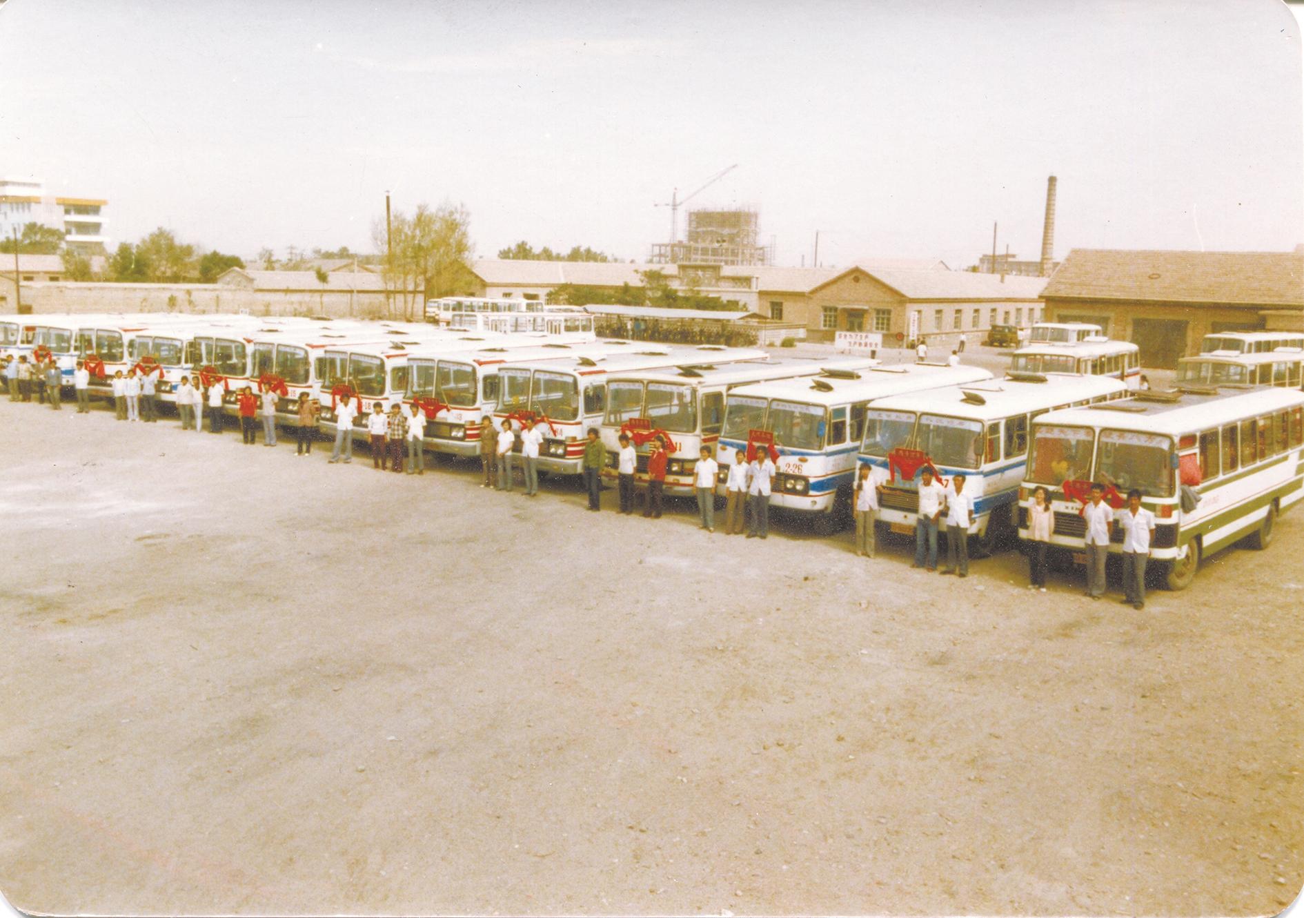 1994年石嘴山、银川、乌海、包头四城市开展的公交服务友谊杯竞赛活动留念。当时的车型是四平汽油车,车上的“标配”是驾驶员一名,乘务人员两名。 (市城市规划建设档案馆提供)