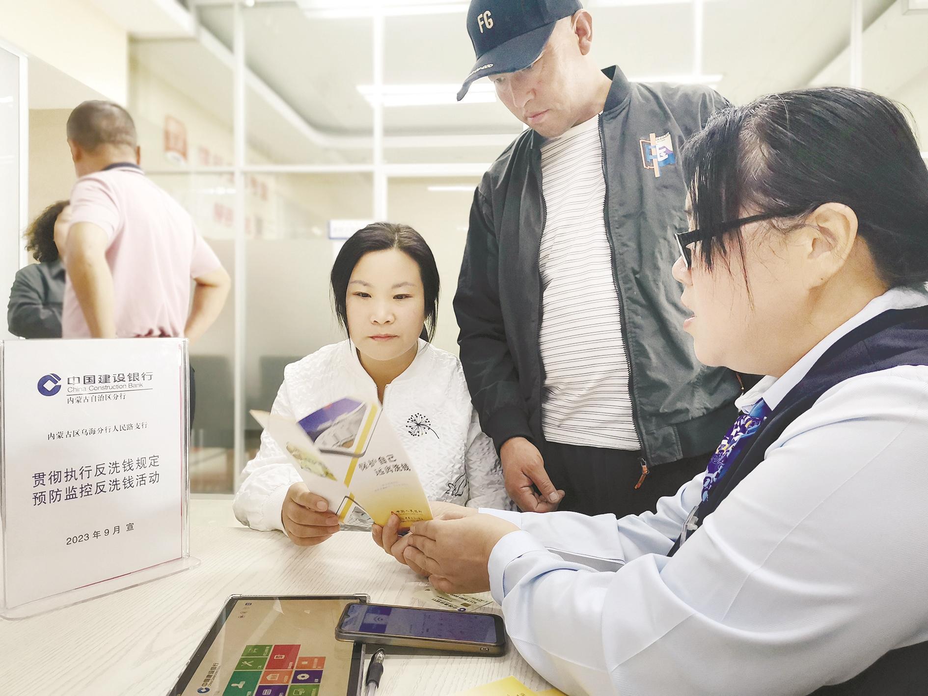 近日,建行乌海分行立足厅堂,设立了业务宣讲台,工作人员向客户宣传金融惠民政策、普及金融知识。 (陈洋 摄)