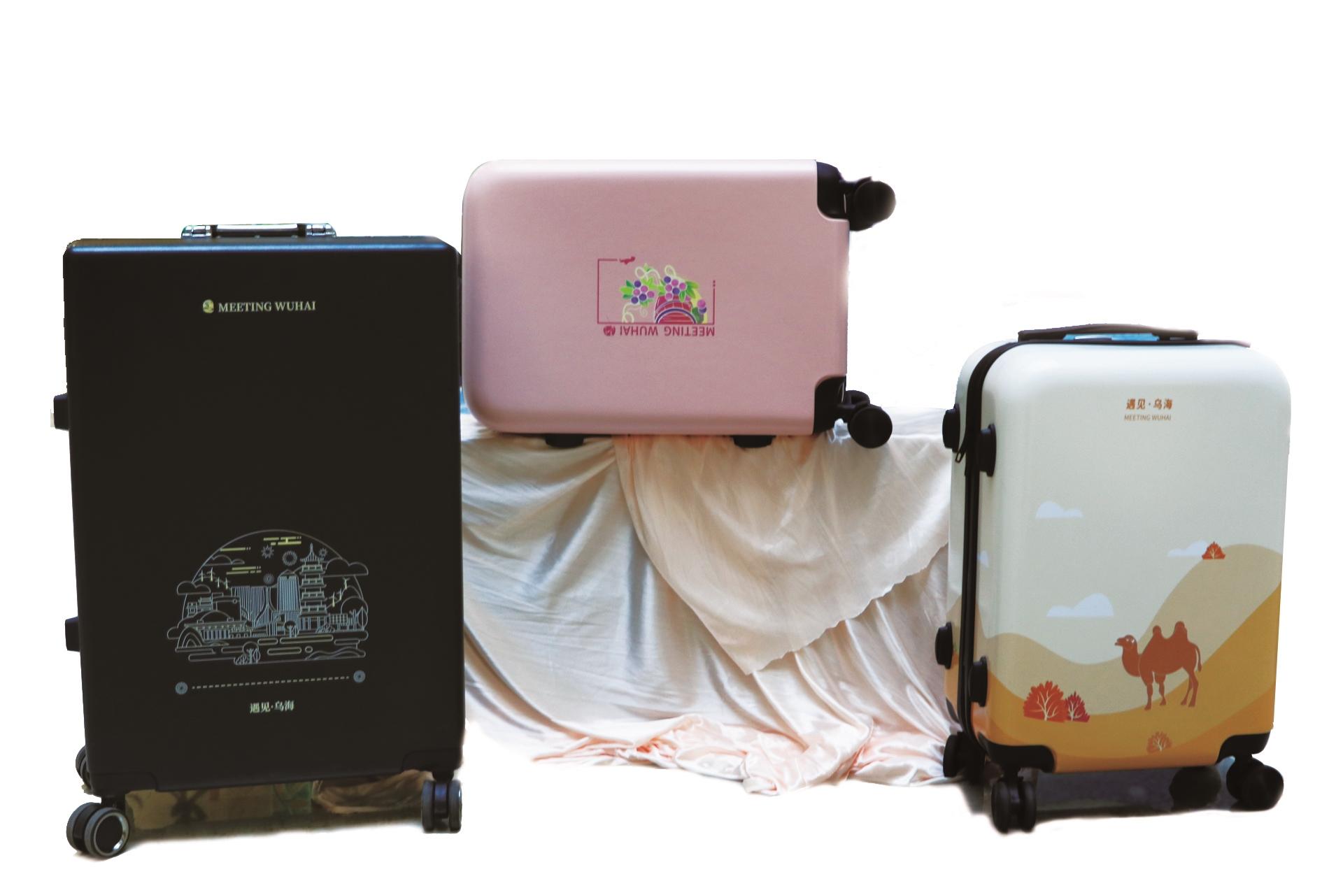 文创旅行箱 旅行箱上的标识为“遇见乌海”,箱体图案上汇集了万达广场、乌海机场、青山翰墨阁、新能源产业等代表我市经济社会发展成果的建筑和事物。沙漠骆驼文创旅行箱中的骆驼代表我市人民艰苦奋斗的精神。 规格:投入市场的黑色旅行箱为20寸。
