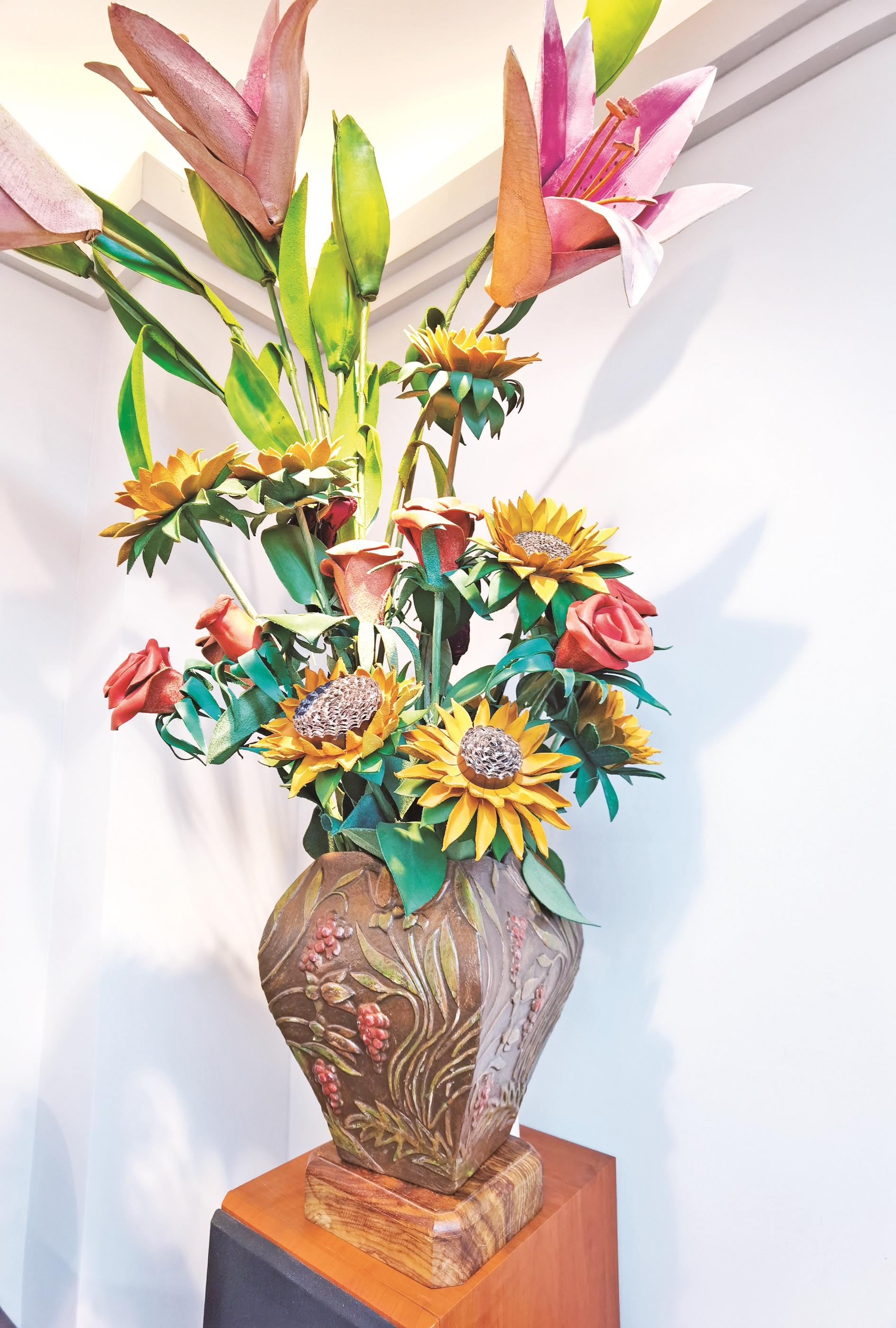 工作室分为3间,外间陈列着部分皮包、皮带、皮挂件,摆放着理发专用的镜子、椅子等设施和工具,如不是特别说明,皮雕制成的花瓶和花束很容易被误认为是铜花瓶、真花束;另外两间均摆放着雕刻着图案的皮质桌案,区别在于一间存放着大量各式各样的皮革和五金件等原料,另一间陈列着张国军的得意之作。
