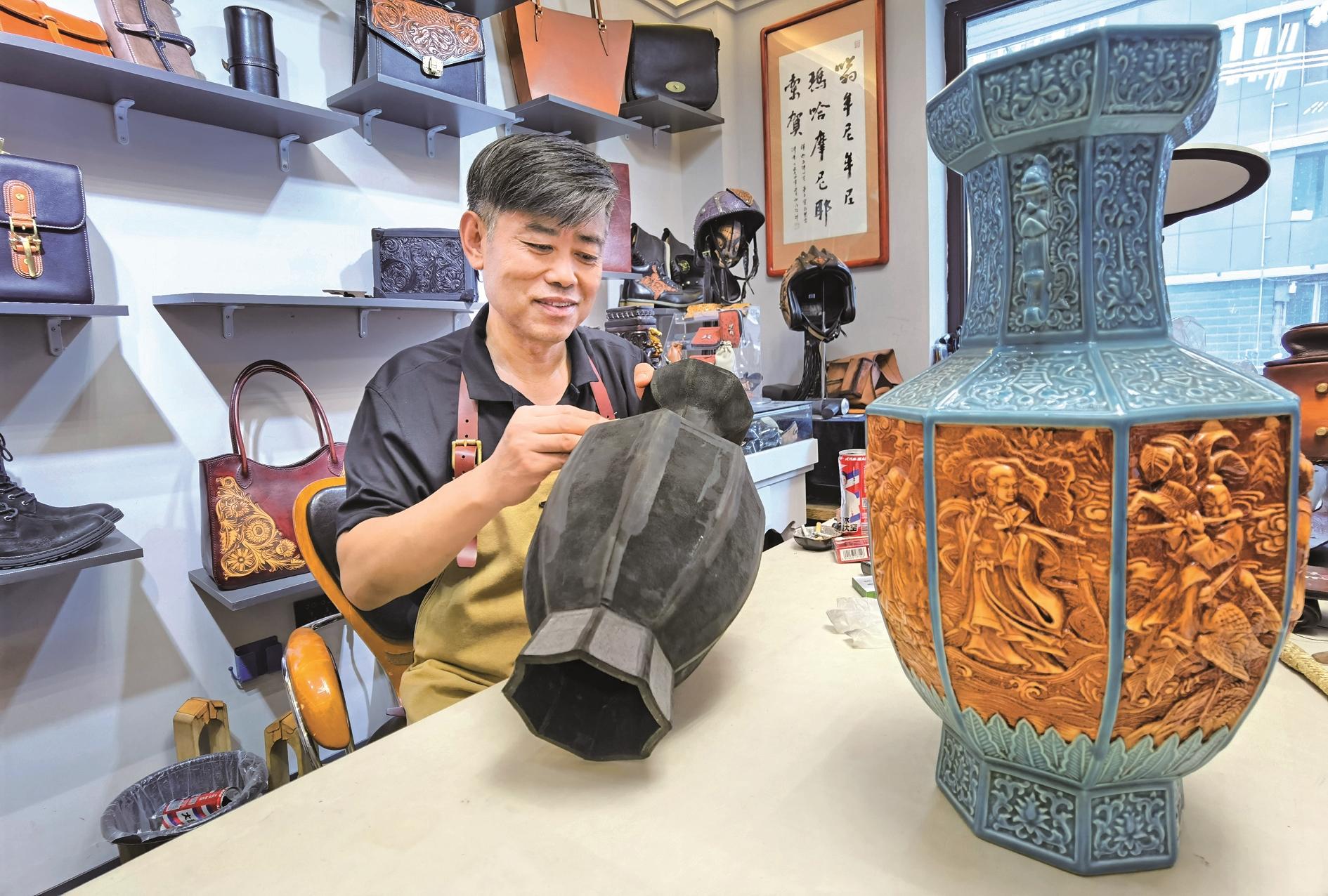 采访时,张国军一边打磨着顾客定制的仿古皮花瓶,一边和记者聊着与皮雕艺术结缘的心路历程。