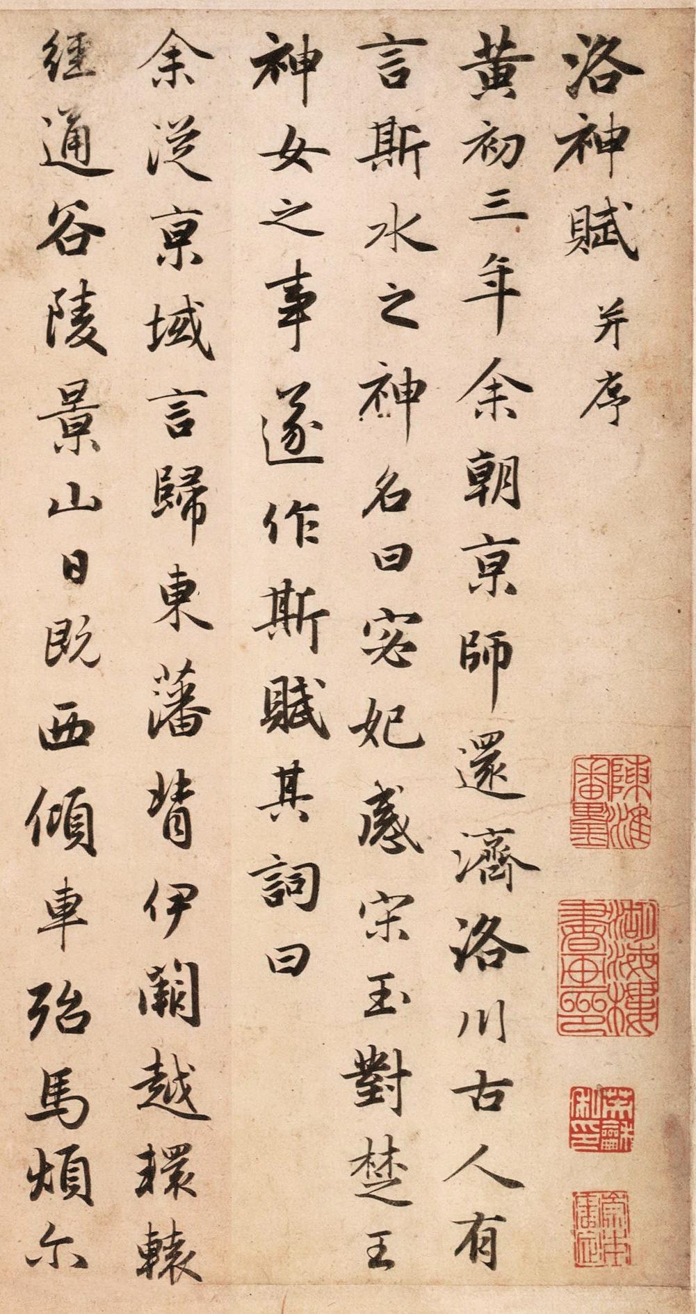 赵孟頫学王,好写《洛神赋》,王献之《洛神赋十三行》的墨迹,当时就收在他的手中。赵孟頫所书《洛神赋》流布海内,不下数十本,真赝混淆,难以辨识。今搜集到赵孟頫行书《洛神赋》比较著名的四种版本: