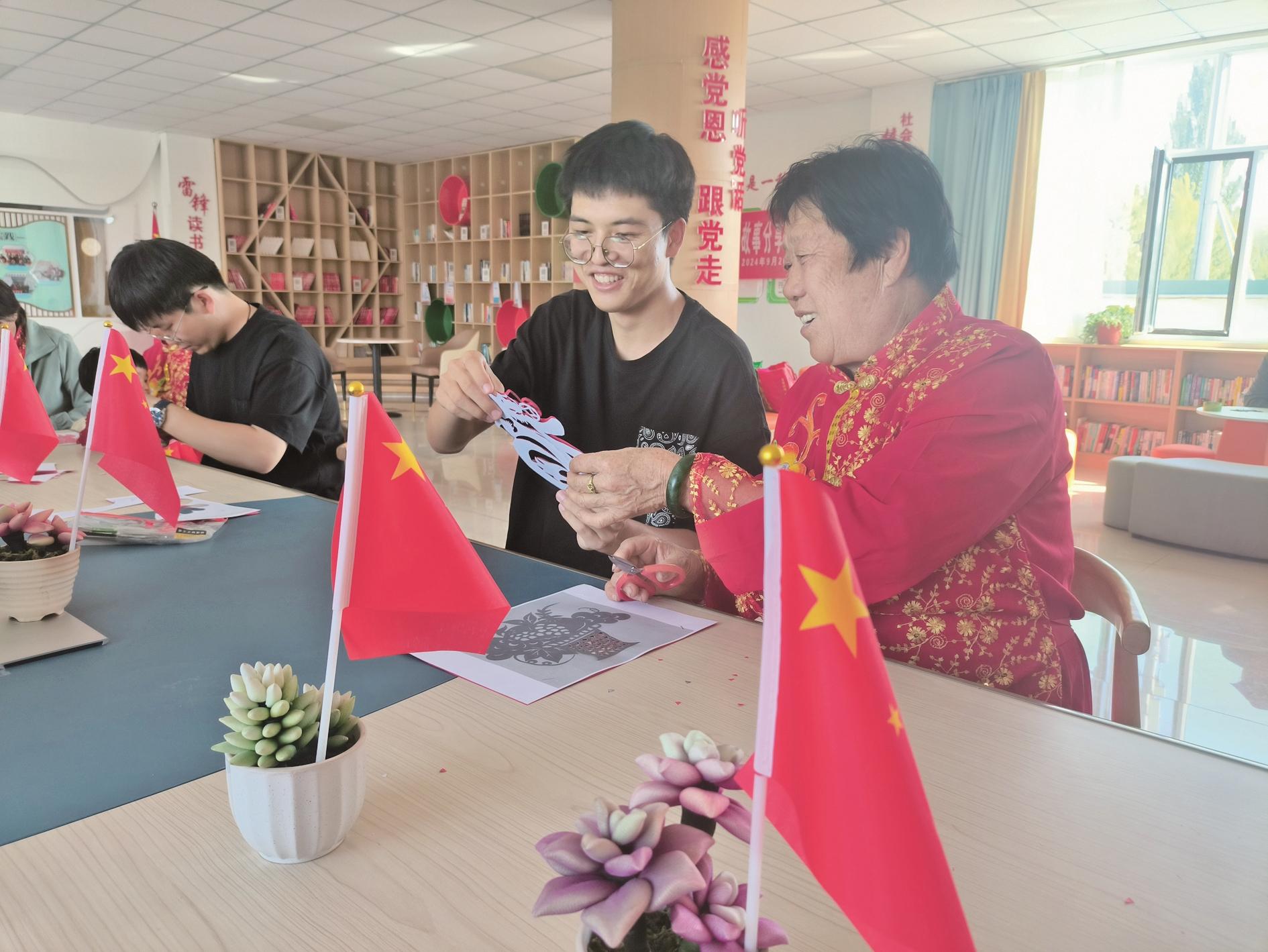 在海勃湾区千里山镇王元地村,“寄情剪纸 欢度国庆”主题剪纸活动也在农区居民的欢声笑语中火热进行。两代人积极互动、热切交流、切磋剪纸技艺,弘扬优秀传统文化,寄情剪纸,庆祝中华人民共和国成立75周年。
