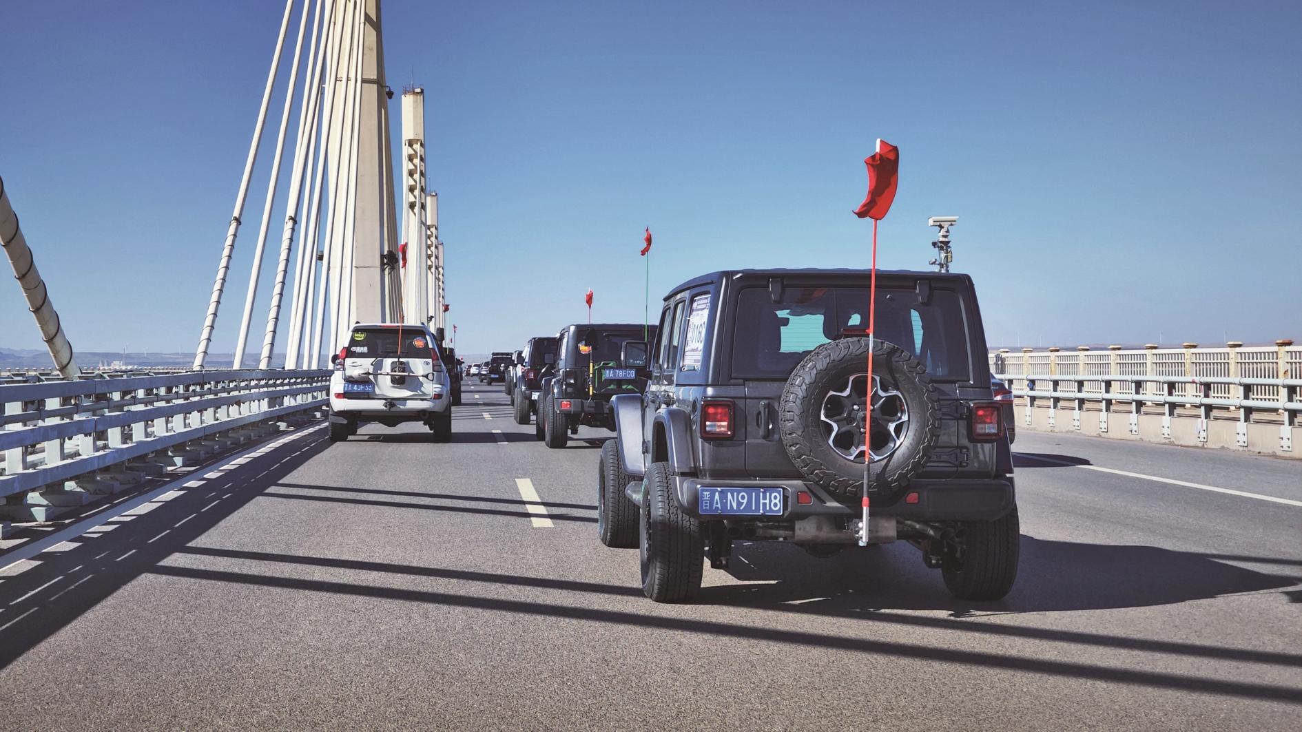 图③正在穿越乌海湖大桥的巡游车队。