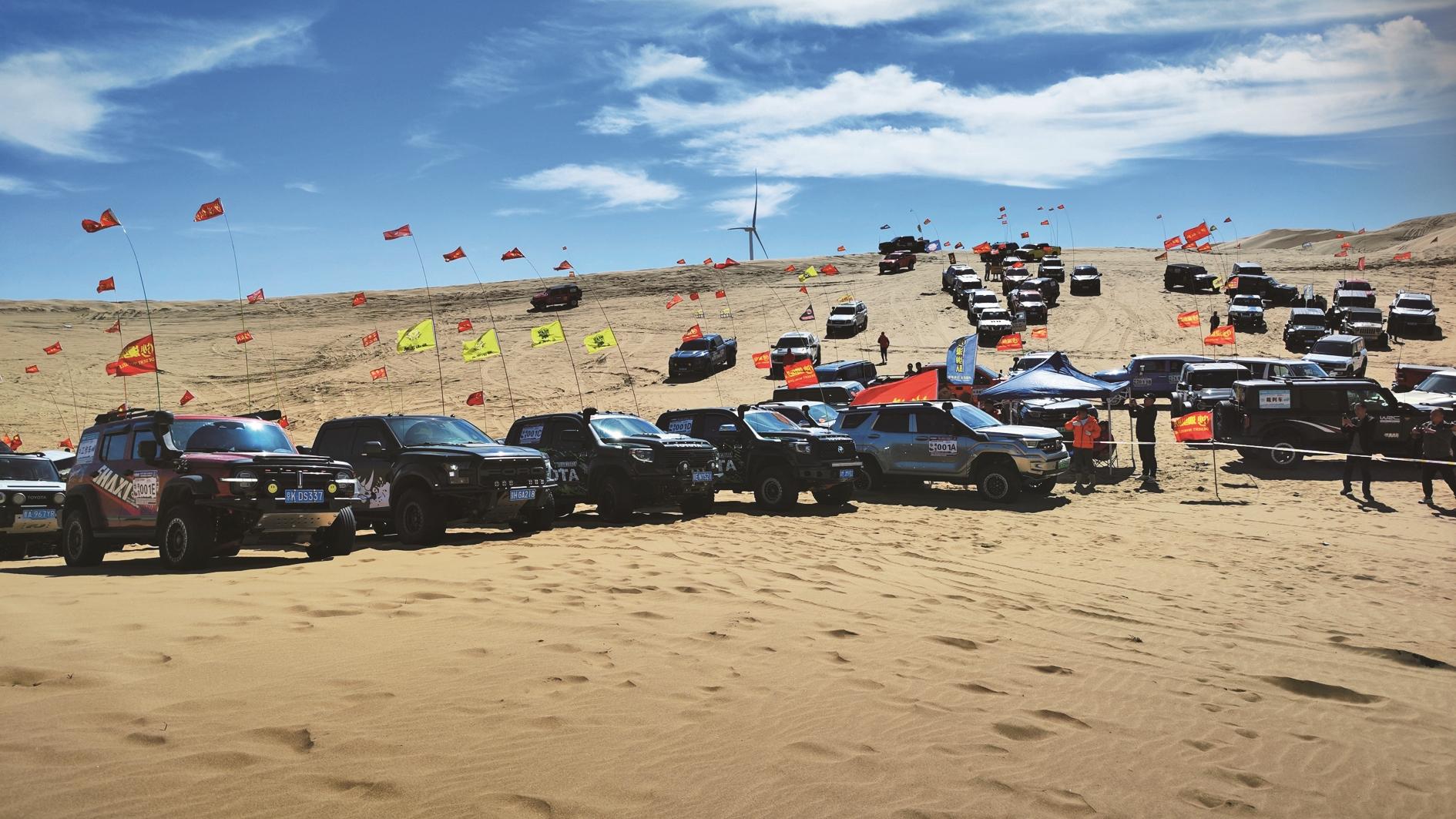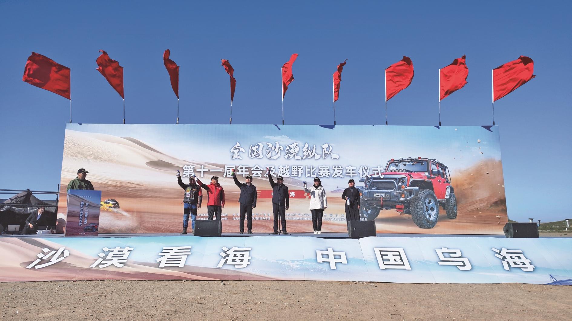 10月1日,全国沙漠纵队第十一届年会及越野比赛发车仪式在我市隆重举行,来自全国各地的越野爱好者齐聚乌海,共同开启充满激情与挑战的沙漠越野之旅。 (赵政宇 摄)