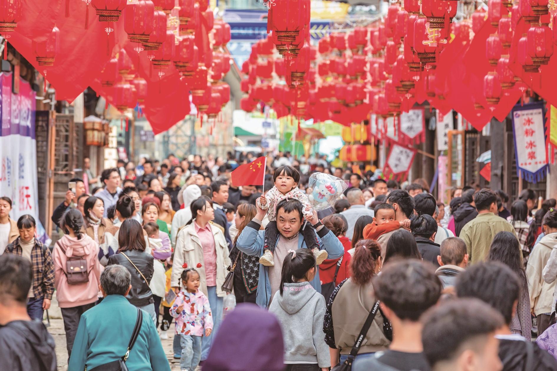 10月2日,游客在贵州省安顺市西秀区安顺古城历史文化街区游玩。国庆假期,人们以各种形式享受多彩假日。