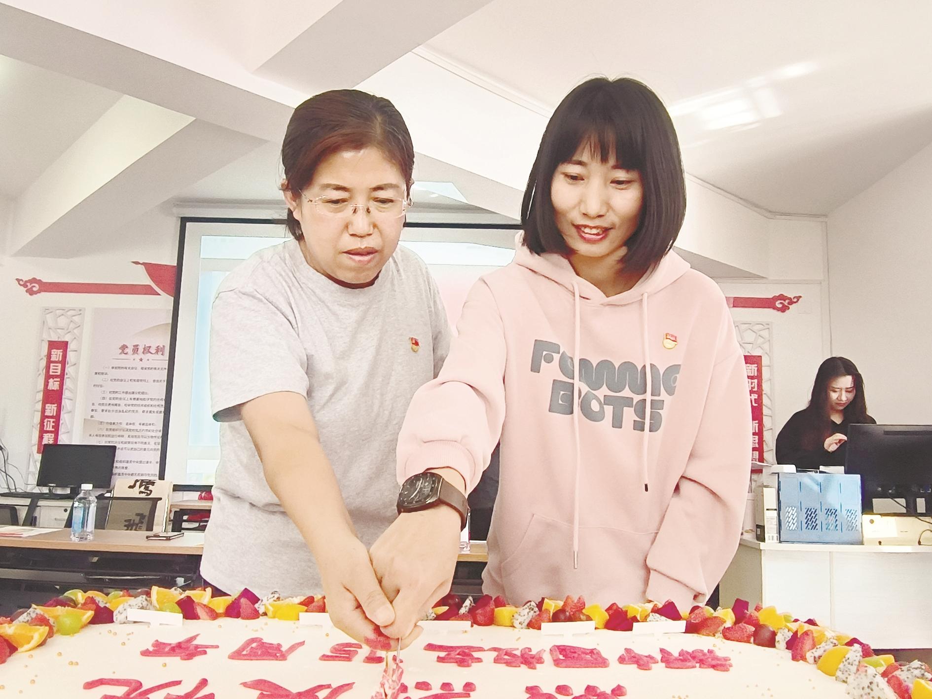 国庆期间,庆祝新中国成立75周年联欢活动在海勃湾区海北街道青山社区举办。活动邀请社区居民一同观看升旗仪式,合唱红色歌曲,书写祝福祖国的贺卡。图为居民和社区工作人员共同切蛋糕,庆祝祖国生日。 (李浩 摄)