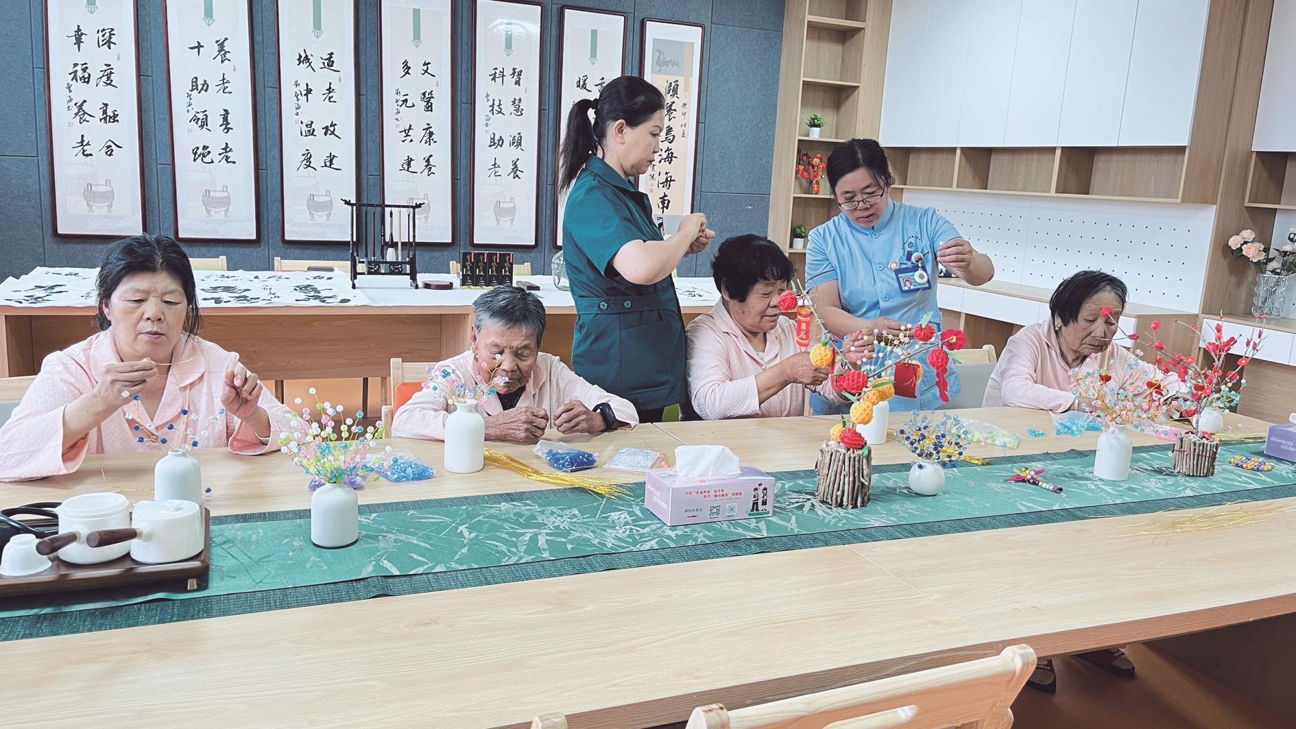 海南区养老综合服务中心特设了护航银发微课堂、插花室、书画室、歌舞厅、棋牌室及健身区,让老年人在这里能够开展书法、手工、茶艺、广场舞等活动,并定期举办健康讲座。中心组建了“家属+长者”“儿童+长者”“青年志愿者+长者”等多元混龄兴趣社群,通过多元混龄活动,增进了各年龄层之间的交流与理解,为老年人带来了欢乐与陪伴。中心还定期邀请专业摄影团队,开展“桑榆未晚,再现芳华”摄影活动,记录下老人们生活中的美好瞬间。