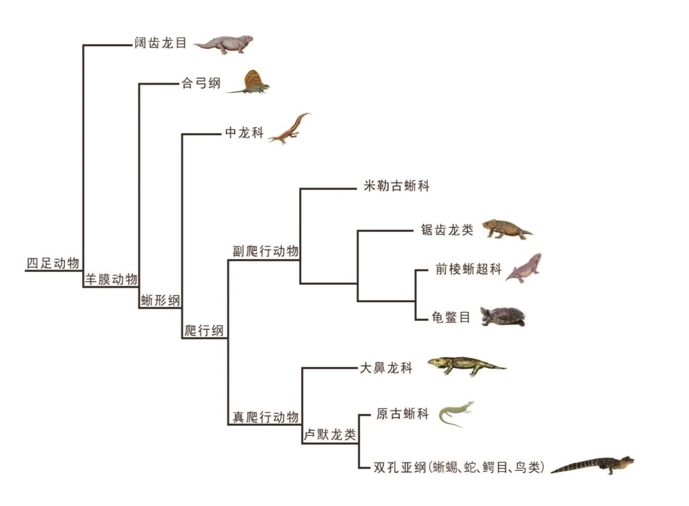 爬行动物由于使用羊膜卵进行繁殖,因此又称羊膜动物。羊膜动物中又可细分为两大类,它们分别是合弓纲和蜥形纲。合弓纲动物在头骨的两侧各有一个下颞孔,又名下孔亚纲,或称为似兽形爬行动物。这是一种以兽孔类为代表的似哺乳类爬行动物,也是所有哺乳动物的祖先,代表性动物是异齿龙。异齿龙的背脊上有数十根骨刺,与皮肤相连,好像一个帆,这些其实是神经棘。关于异齿龙帆的功能有一种假说认为它可以起到调节体温的作用。早晨气温较低时,异齿龙将帆正对着阳光,以此加热血液;而在气温较高时,它们又可以躲在树荫等阴凉处,靠帆来降低体温。合弓纲在中生代的白垩纪就灭绝了,后代演化出的哺乳类在新生代时期统治了世界。