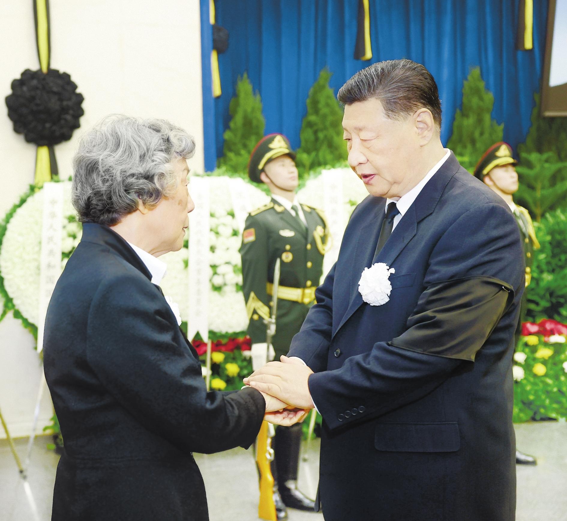10月14日,吴邦国同志遗体在北京八宝山革命公墓火化。习近平、赵乐际、王沪宁、蔡奇、丁薛祥、李希、韩正等前往八宝山送别,胡锦涛送花圈表示哀悼。这是习近平与吴邦国亲属握手,表示深切慰问。 新华社记者 鞠鹏 摄