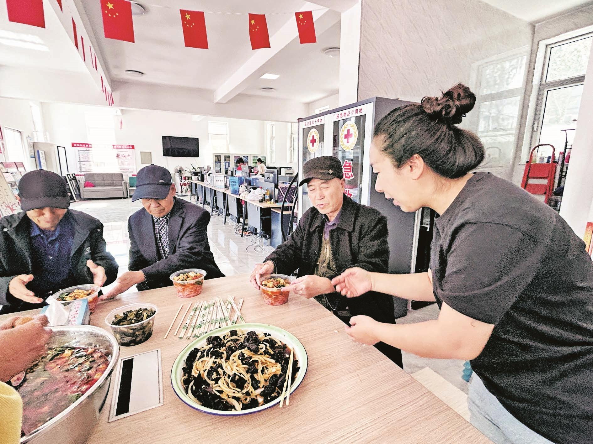 乌达区滨海街道胜利社区工作人员为老人送上“暖心面”。(赵政宇 摄)