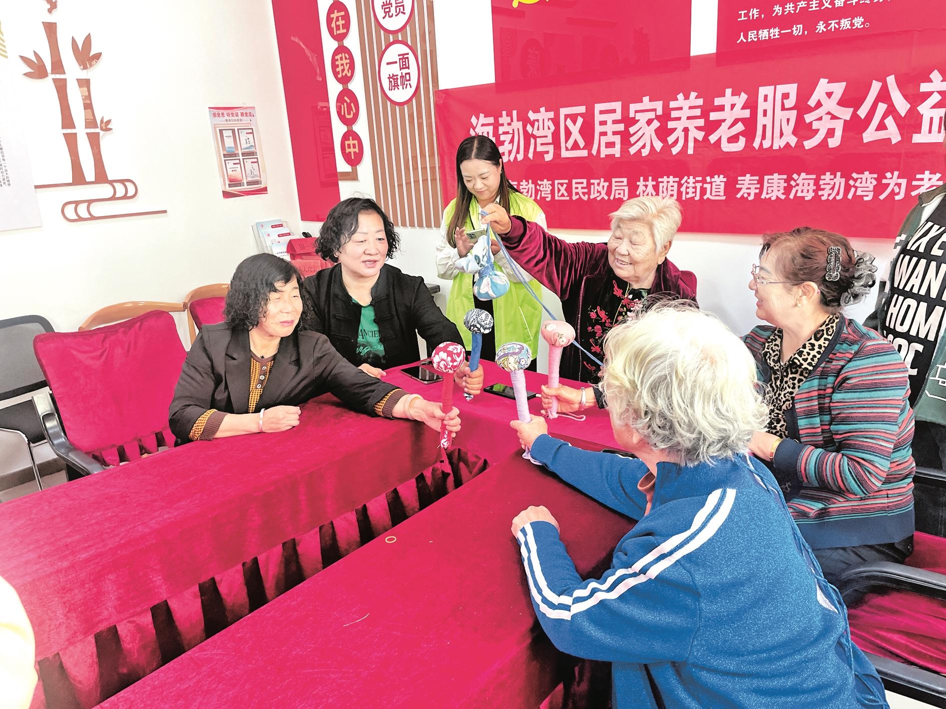 海勃湾区林荫街道邀请老人一起制作艾草锤。 (赵政宇 摄)