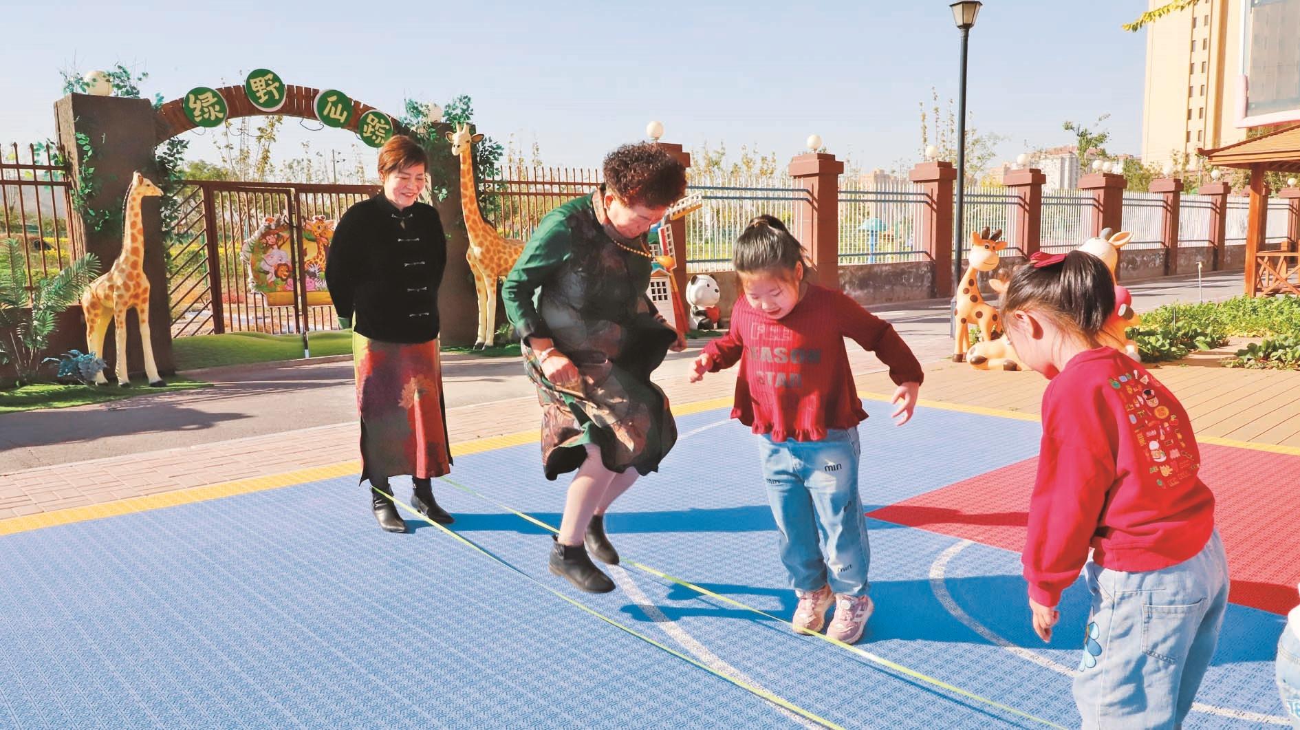 海勃湾区第十五幼儿园内,萌娃与长辈们共度重阳美好时光。(赵政宇 摄)
