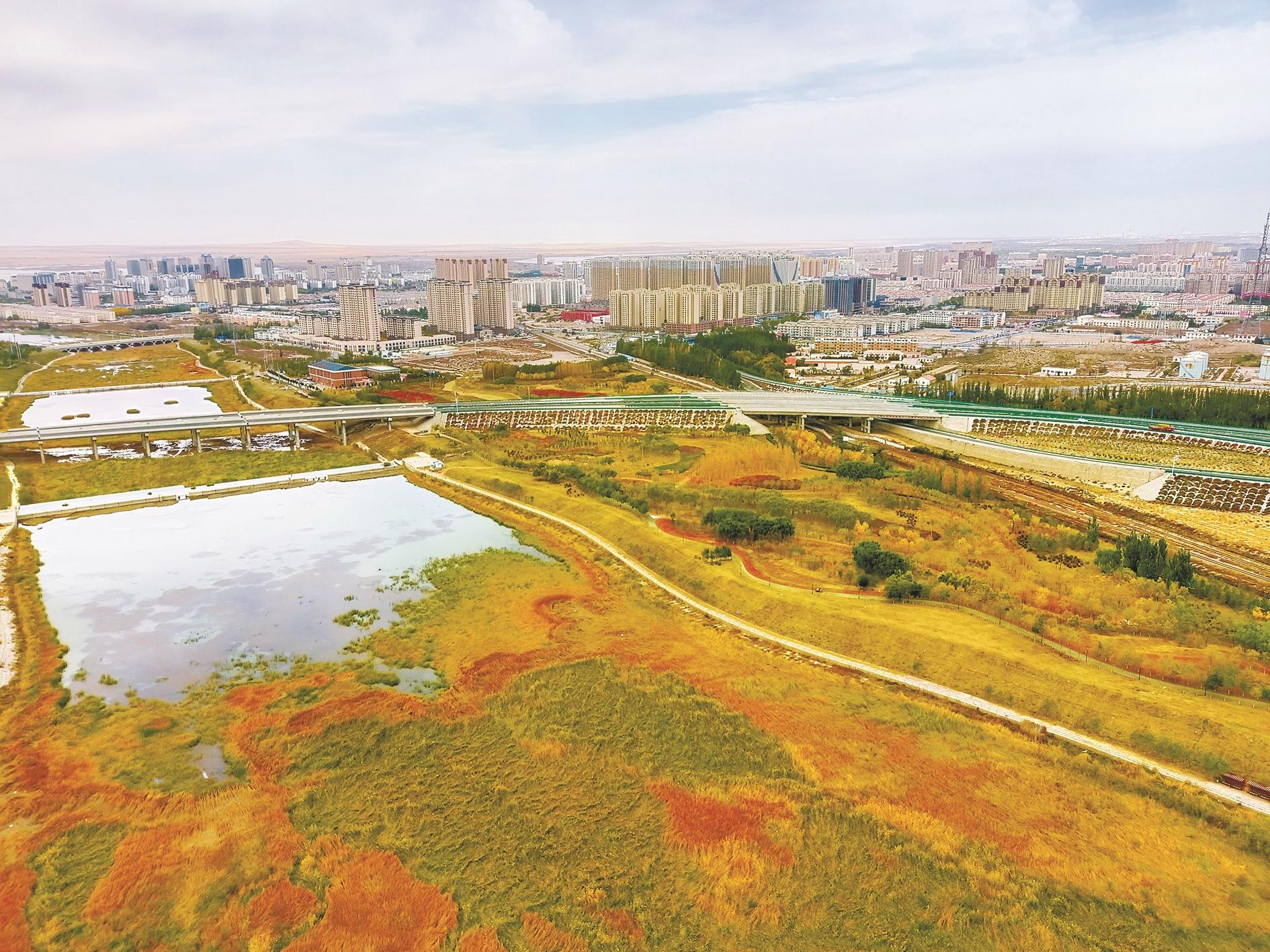 金秋十月,天高云阔。乌海大地层林尽染,色彩斑斓,呈现出一派壮美的北国秋色。图为城区一角。