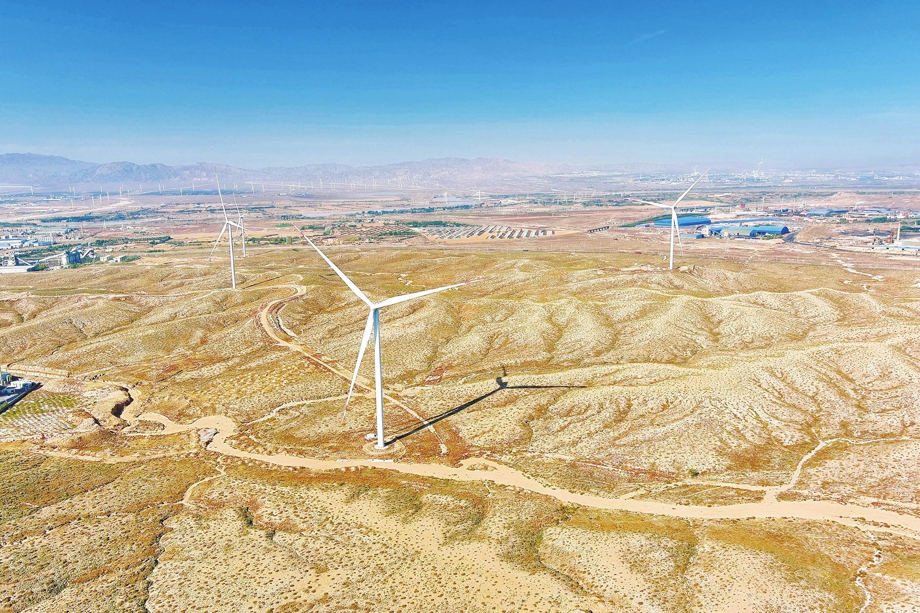 通体洁白的风力发电机高高耸立,巨大的叶片随风转动,在阳光照射下熠熠生辉……10月15日,走进乌海协合维昱新能源分散式风电项目,6台风电机组由南向北呈多边形渐次排开,硕大的风机机组将风力转换为电力,实现年均发电量达到7074万千瓦时。 (王超 摄)