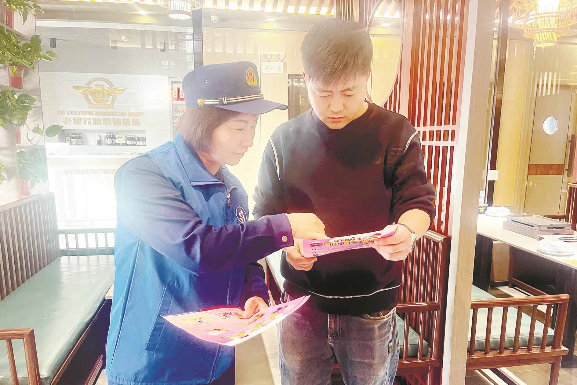 近日,海勃湾区消防救援大队开展了消防安全宣传活动。活动中,消防队员来到餐饮场所,通过发放资料、现场讲解等形式,宣传普及用火用电用气安全、火灾预防、应急疏散等知识,进一步提高辖区居民群众消防安全意识。(黄建飞 摄)
