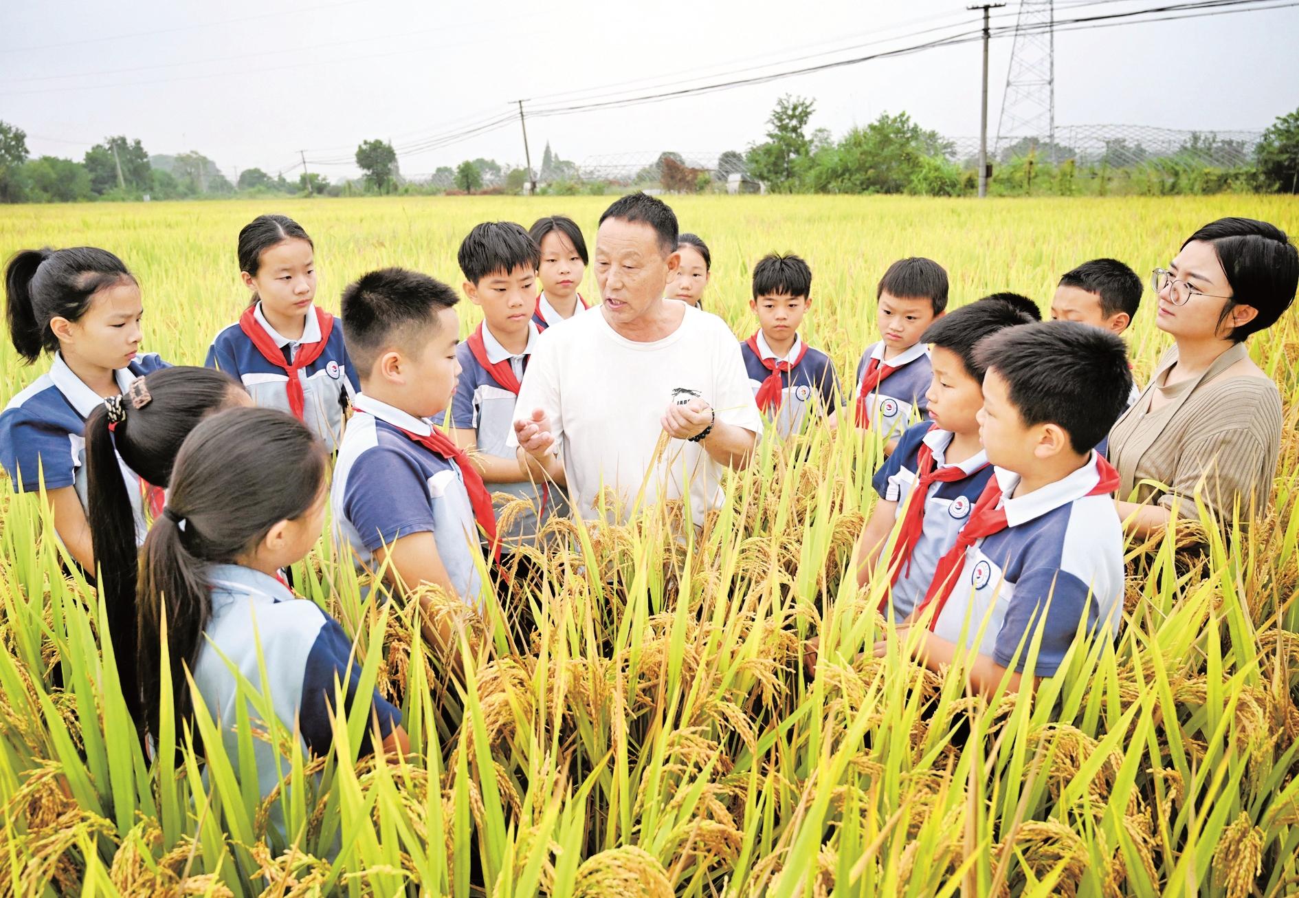 10月16日,浙江省武义县三角店小学学生在壶山街道三角店村稻田里听农民讲水稻种植过程。当日是世界粮食日,各地开展主题教育活动,增强孩子们爱惜粮食、节约粮食的意识。