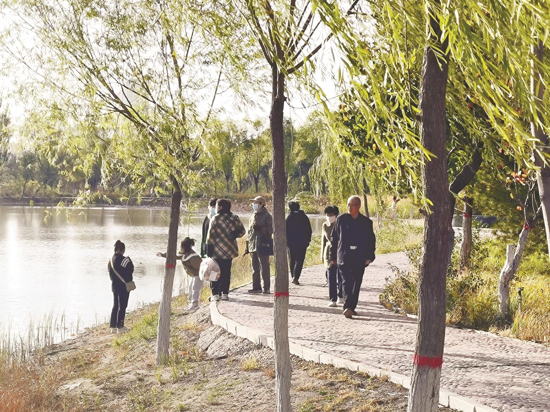 近年来,我市大力推进国土绿化工作,积极提升国土绿化水平,打造充满绿意的宜居社区。金秋10月,在蓝天白云的衬托下,居民纷纷到公园、绿地休闲健身。 (李浩 摄)