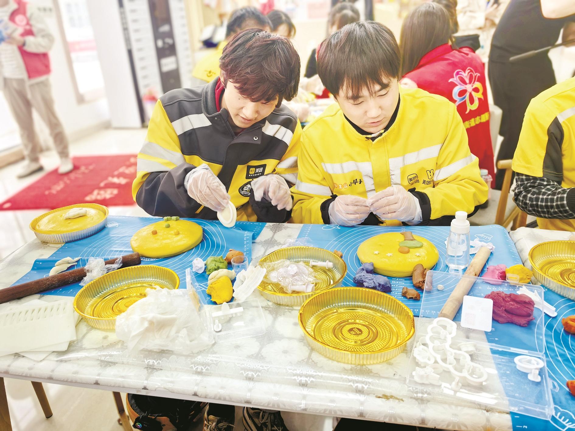 近日,海勃湾区滨河街道办事处工会、滨河街道湖东社区联合工会开展了“和谐一家亲 共叙邻里情”糕点制作活动。活动中,社区工作人员、辖区居民围坐一起,边聊天边制作糕点,现场气氛十分热闹融洽。(黄建飞 摄)