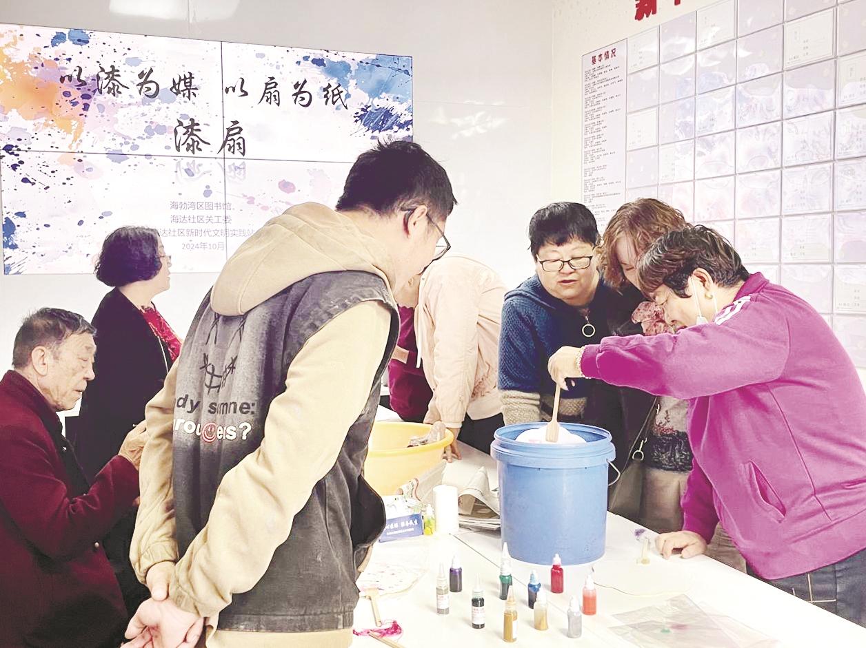近日,海勃湾区新华西街道海达社区新时代文明实践站、海达社区关工委与海勃湾区图书馆共同开展非遗漆扇手工制作体验活动,为传承和弘扬中华优秀传统文化贡献力量。 (毕晓敏 摄)