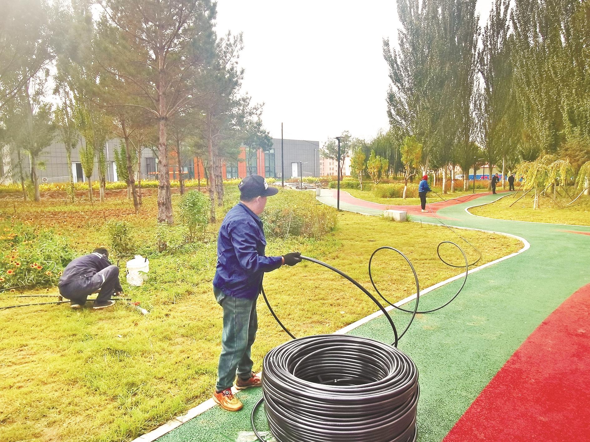 10月18日,在海南区拉僧仲街道办事处社区卫生服务中心北侧的口袋公园,园林绿化工人在铺设滴灌管。滴灌系统全部铺设完毕后,可以确保每一棵树木“喝饱水”,促进植被茁壮成长。 (鲁吟 摄)