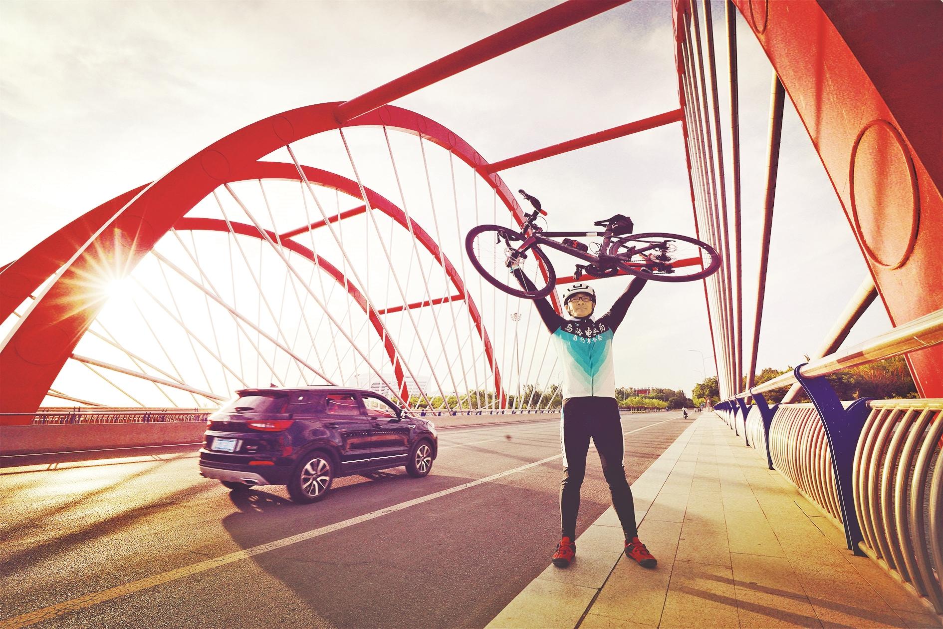 行至终点,骑手举起他酷炫的公路自行车抒发惬意的心情。在这个温暖而宁静的时刻,夕阳的余晖斜照在桥梁上,映射出金色的光芒,定格成一幅绚丽的画面。骑行在路上,与大自然融为一体,你也是路上最美的一道风景。