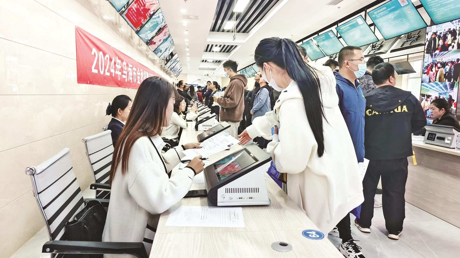 10月25日,市人社局联合多家单位开展“就在金秋 职面未来”2024年乌海市金秋招聘月暨民营企业、中小企业专场招聘,旨在帮助高校毕业生、就业困难人员、退役军人、脱贫劳动力等重点群体与各类有用人需求的企业搭建对接桥梁,赋能企业高质量发展。活动中,共有30多家企业参与其中,为各年龄段、各学历层次的求职者提供了600多个就业岗位。(陈佳男 摄)