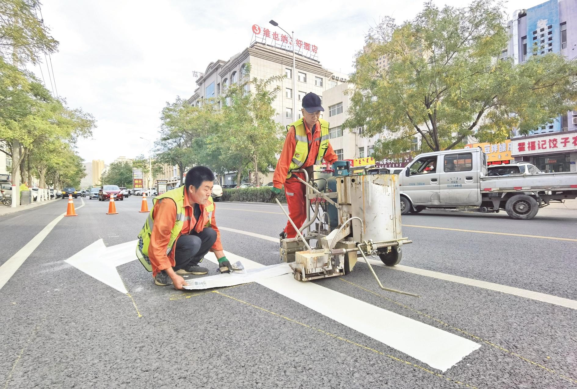 海勃湾区黄河东街新铺的路面上,经过测量定位、水线打底、热熔喷涂等工序后,一条条明亮显眼的交通标线、车道导向标线便施划完成,工人们当即赶往下一个路口继续忙碌,而路口的车辆按照崭新的标线有序等待、驶离。