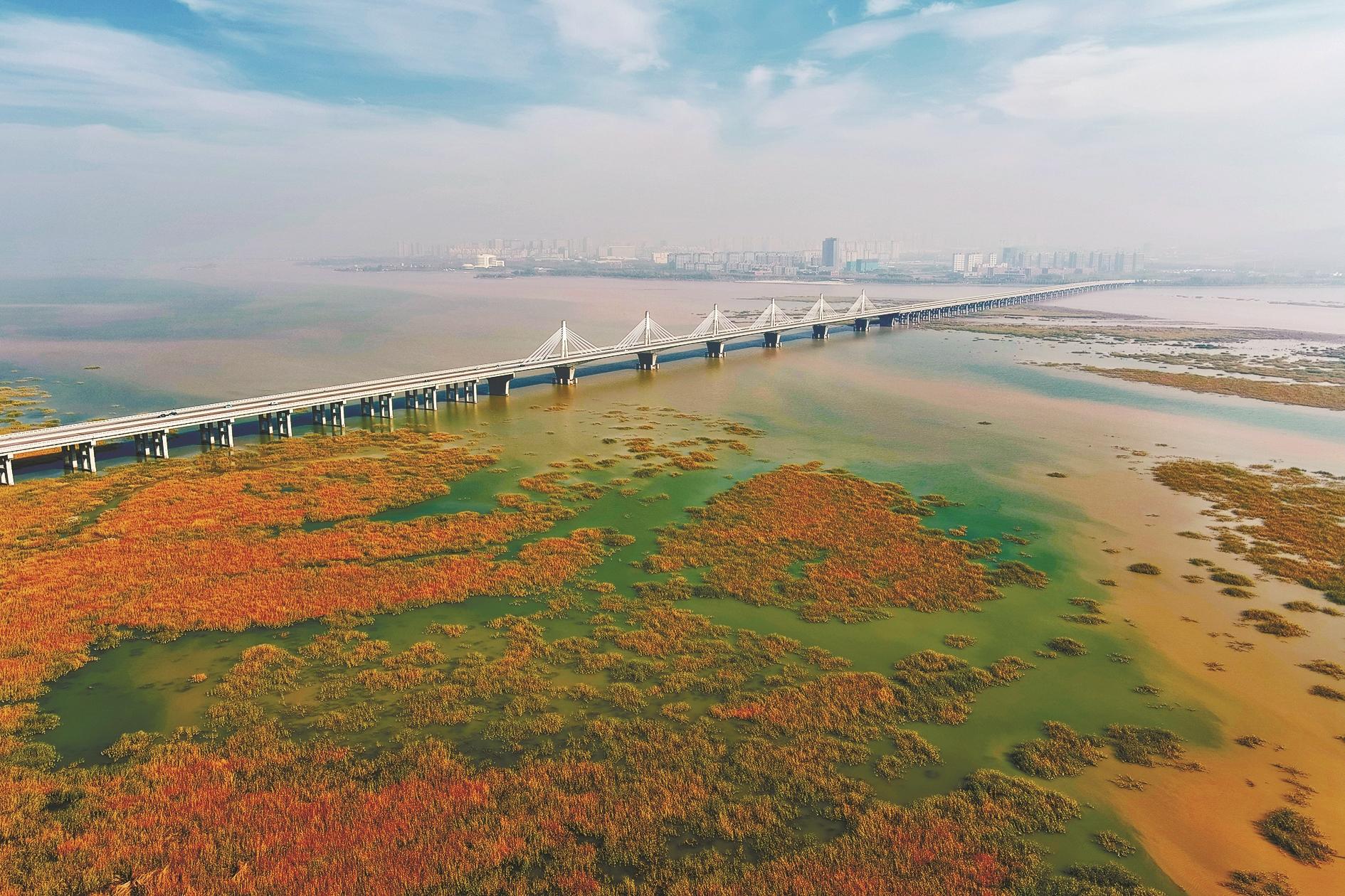 金秋时节,黄河乌海湖大桥迎来最美观景季。远眺四周,湖中滩涂的芦苇、远方的城市美景,在云雾迷蒙间若隐若现,相互交织融合,给秋日的乌海增添了一份独特的韵味,成为市民观景打卡点。(王超 摄)