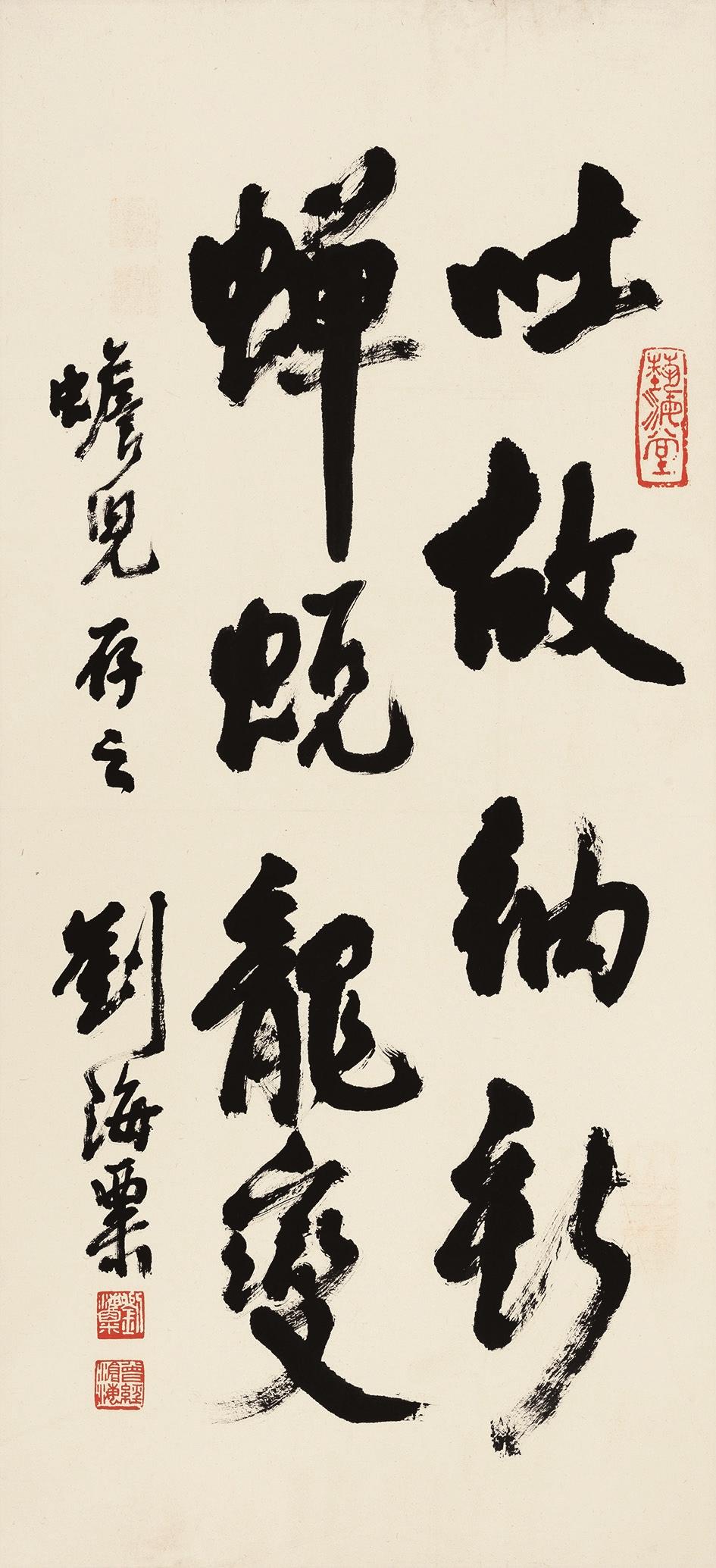 刘海粟(1896—1994年),字季芳,号海翁,江苏武进人,17岁(1912年)与乌始光等在上海乍浦路创办上海图画美术院,后易名上海美术专门学校(以下简称“上海美专”),1921年,与康有为结识,随拜入康门游学问字。刘海粟的书法有着坚实的基础,从小习写唐代颜柳诸大家及宋代欧阳询《九成宫醴泉铭》等法帖,取法有渊源,用笔有来路。而师从康有为学习书法与诗文后,则注重篆籀笔意,大量临习商周金文、汉魏六朝碑刻,得金石之雄浑、厚重、宽博、开张。帖碑会通之下,刘海粟的运笔风光流转,线质劲足神完,似游龙般逶迤矫健,如崩云般浑莽凝厚,古拙而灵秀,一派奇崛苍茫。