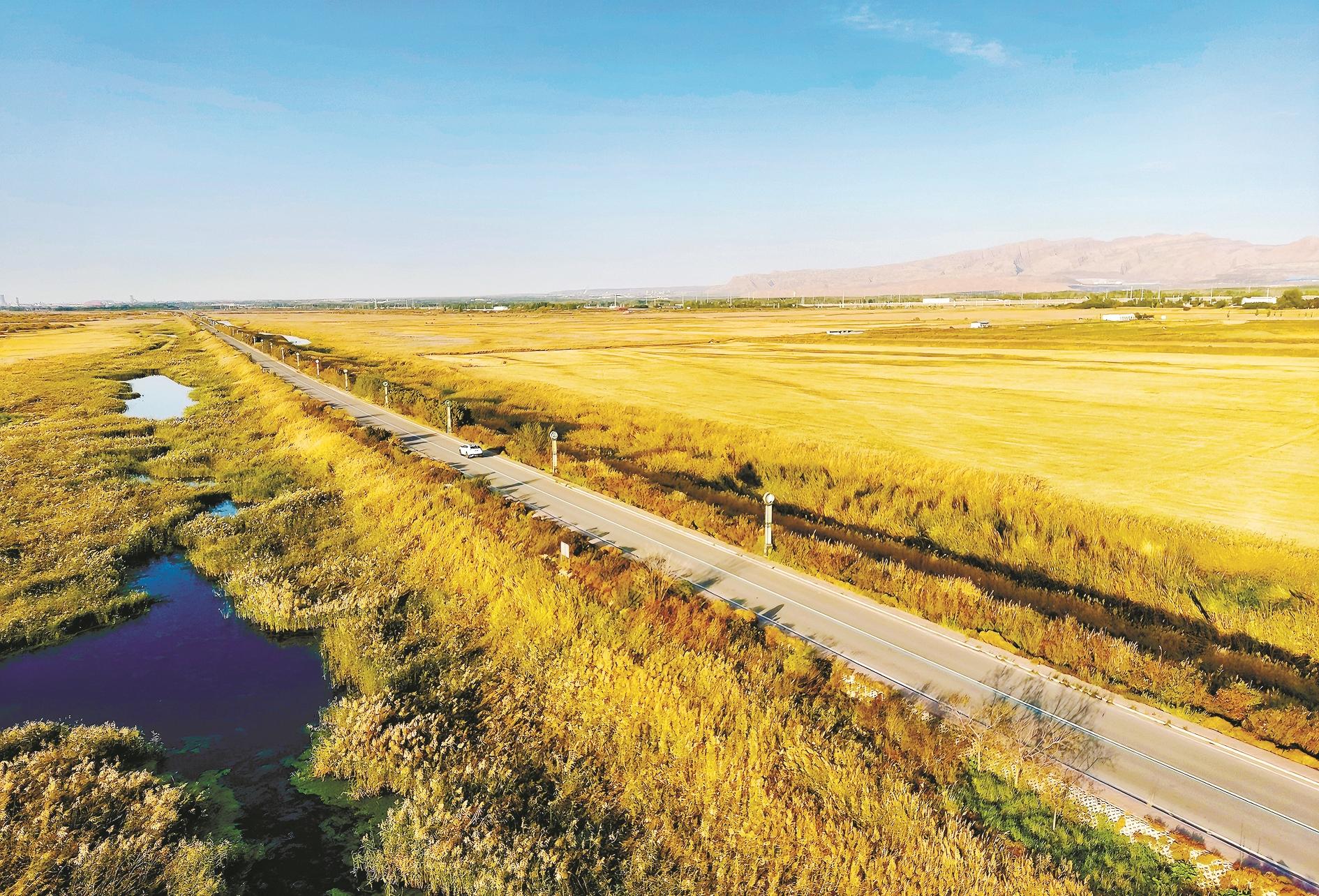 深秋时节,龙游湾国家湿地公园风景多姿多彩。蓝天白云下,公路、芦苇、河流、山峦等相映成景,构成了一幅美不胜收的画卷。