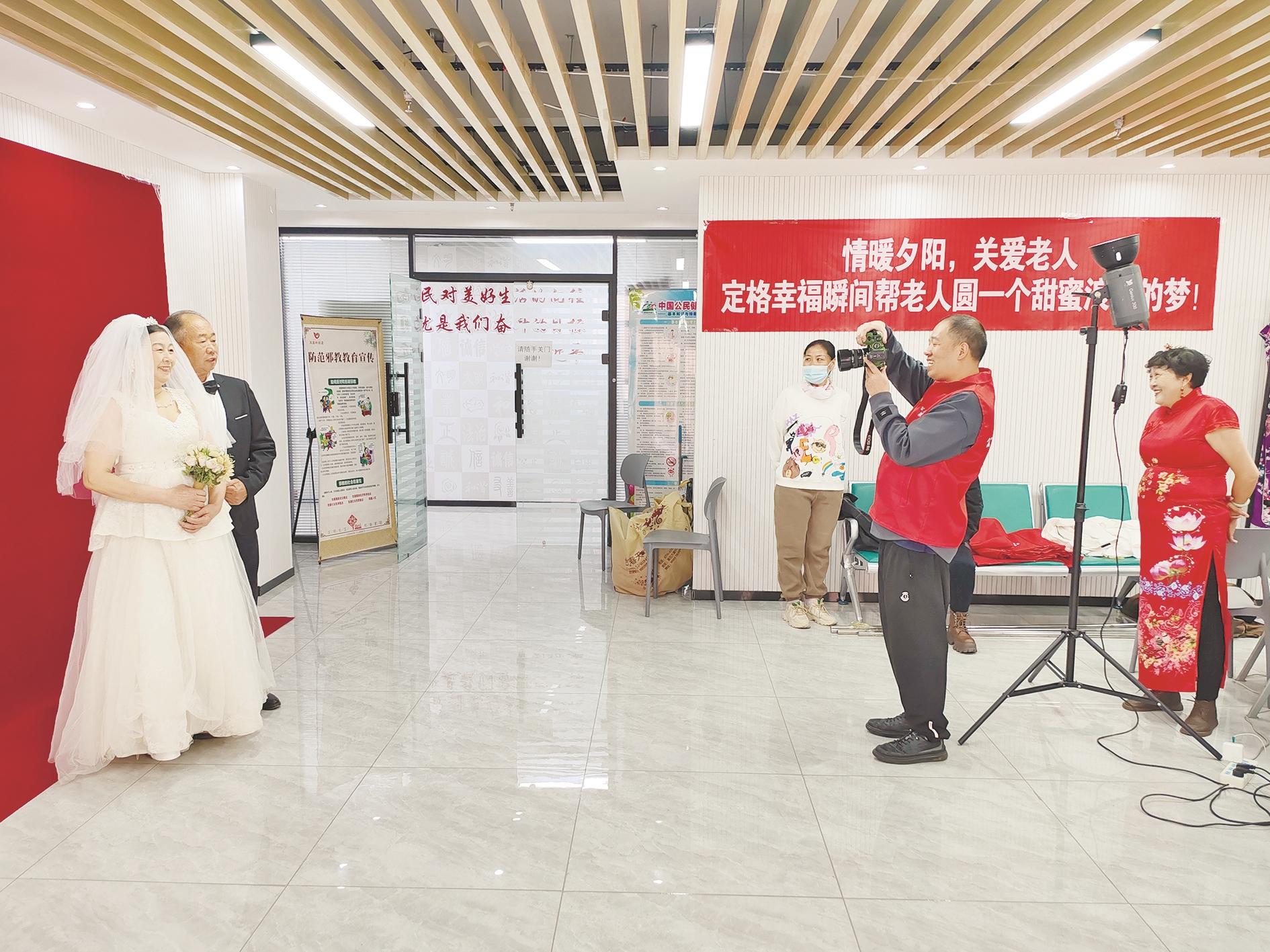 图①近日,海勃湾区凤凰岭街道新城社区举办“定格幸福瞬间,帮老人圆一个甜蜜浪漫的梦”主题婚纱摄影活动,为辖区40周岁至75周岁中老年夫妇免费拍摄婚纱照。 (张楚研 摄)