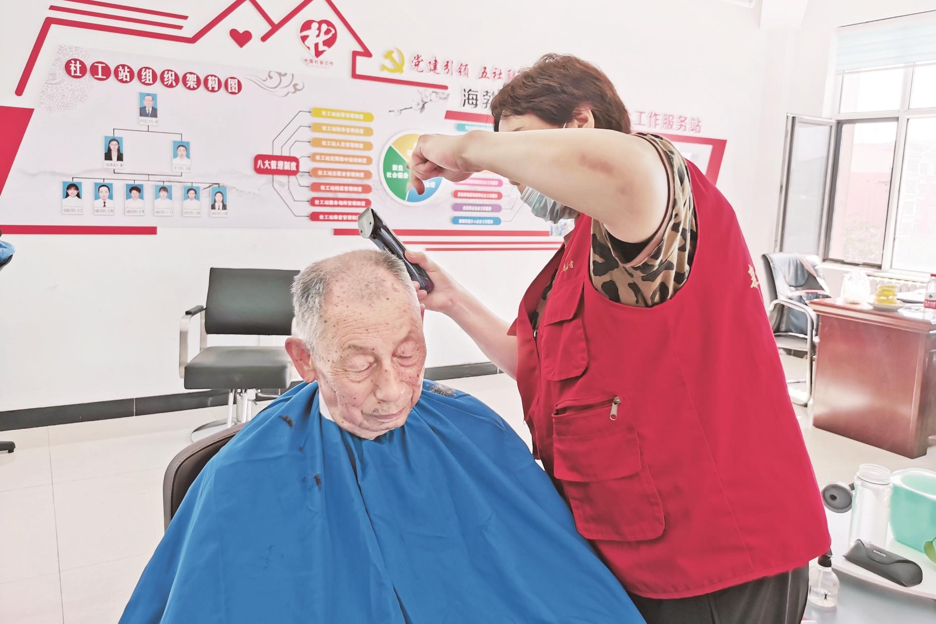 图②近日,海勃湾区新华街道清泉社区开展爱心义剪志愿服务活动,为辖区老年人免费理发,陪老年人唠家常、话家事,提升了辖区居民的幸福感和满意度。 (黄建飞 摄)