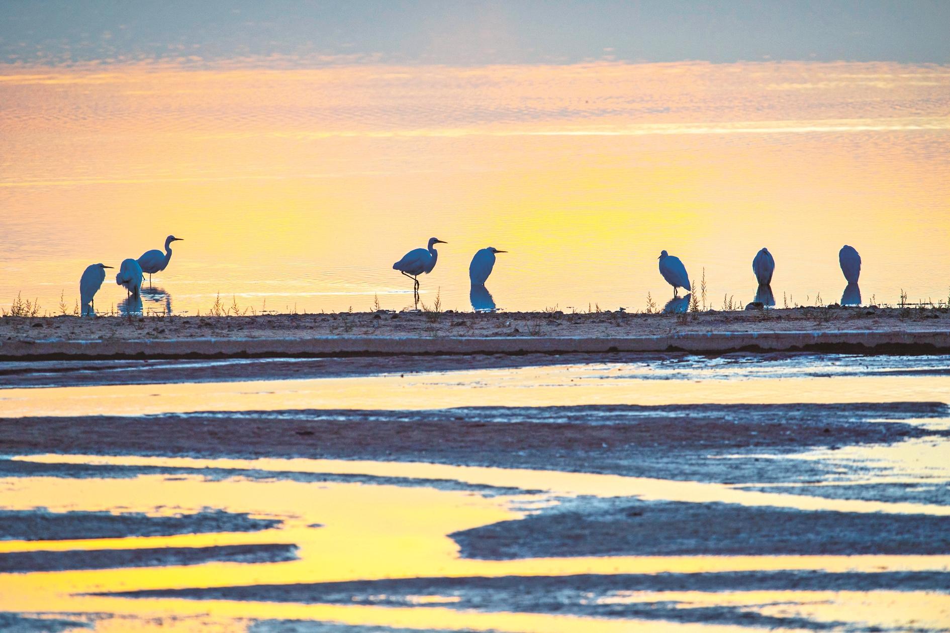 10月29日,在甘肃省酒泉市阿克塞哈萨克族自治县境内的冬不拉水库,白鹭在夕阳下歇息漫步。秋日里,各地层林尽染,宛如一幅幅绚丽的秋日水彩画。 新华社发(高宏善 摄)