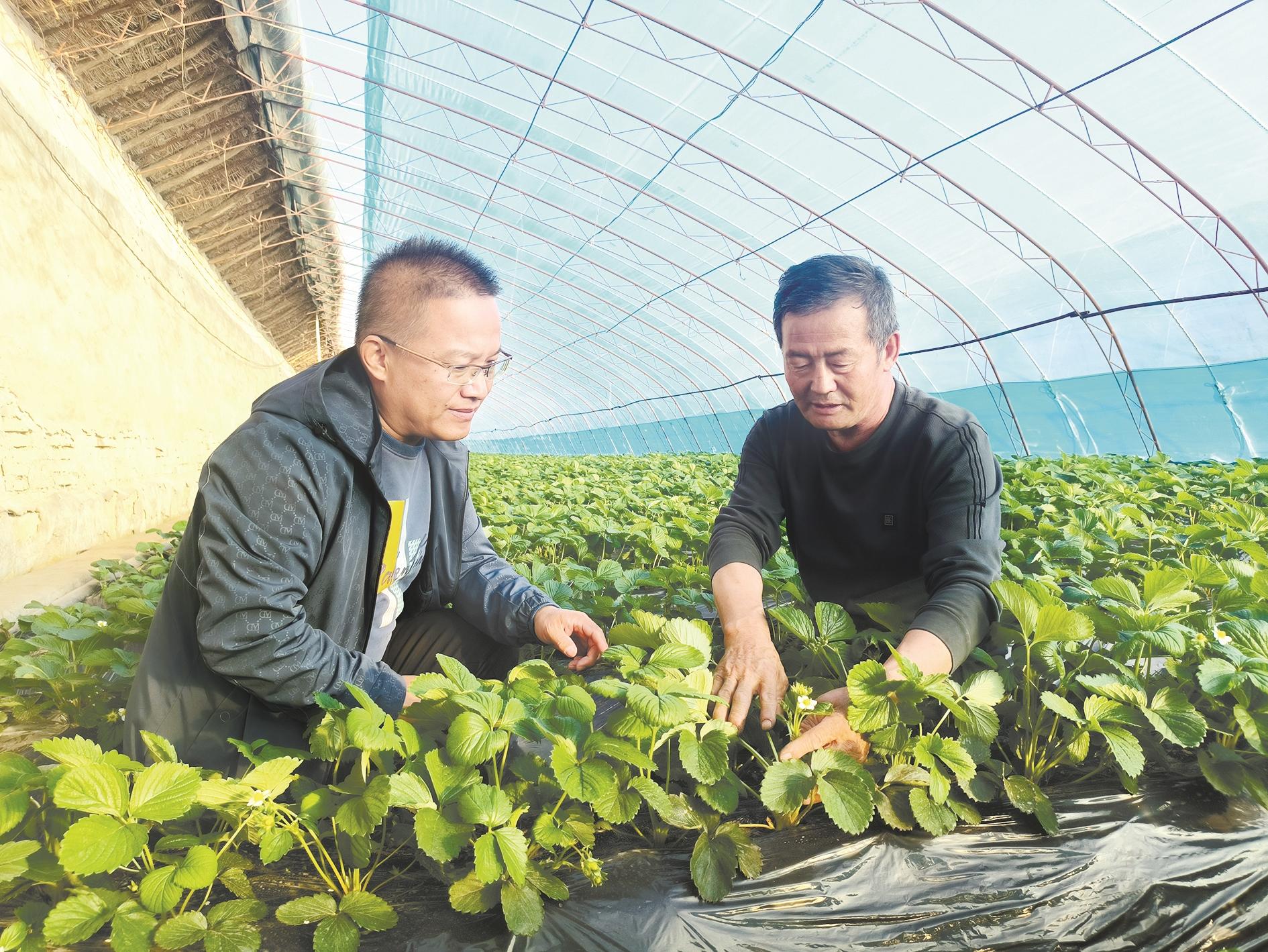 草莓种植户王有旺(右)向新园社区第一书记贺坚强介绍草莓长势。(路静 摄)