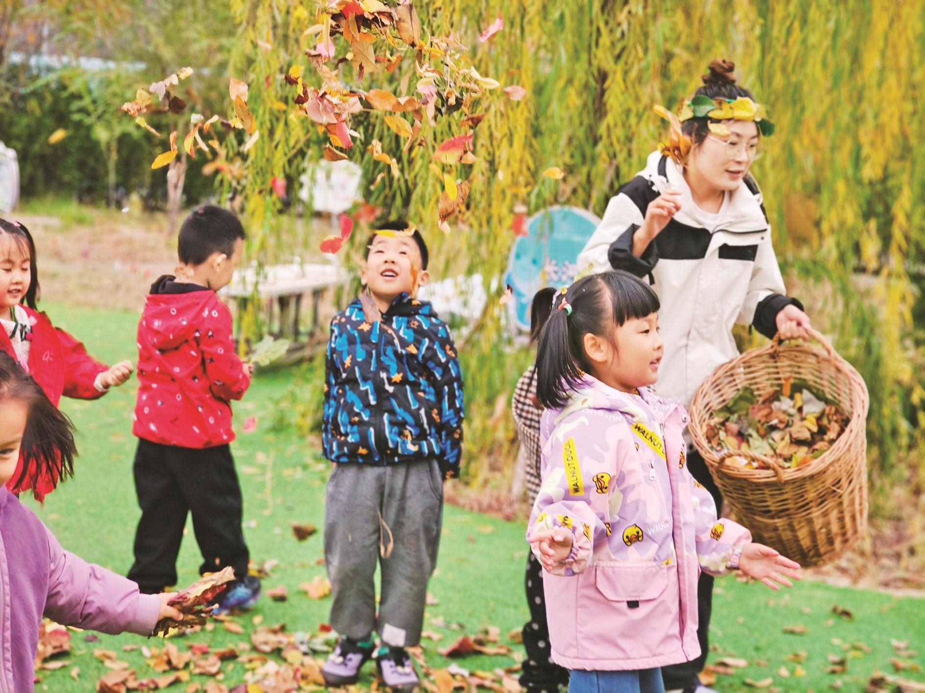 11月4日,海勃湾区第十二幼儿园的孩子们在户外活动区域“拾秋”。在老师的带领下,孩子们把落叶当作玩具、道具,制作树叶画、装饰衣服,以此认识秋天、感知秋天。 (姜瑜 摄)