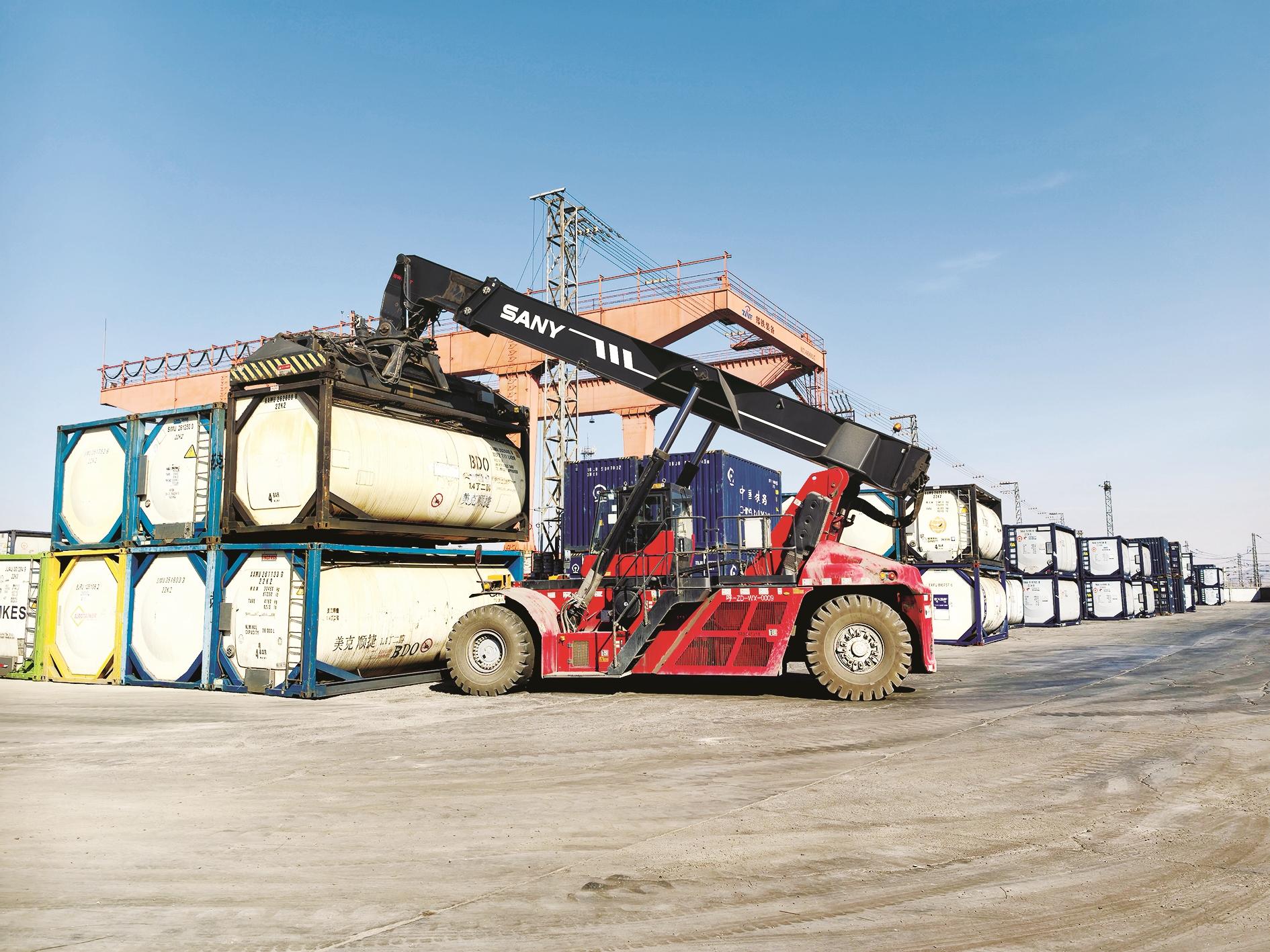 集装箱正面吊正吊运装有BDO产品的罐式集装箱。(刘洋 摄)