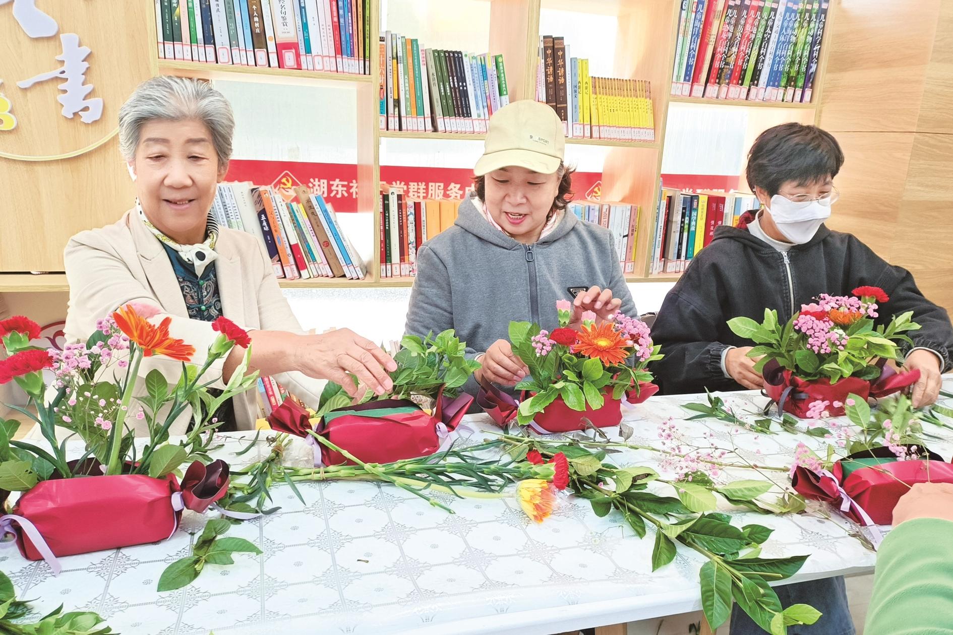 近日,海勃湾区滨河街道湖东社区举办了“如花绽放 芬芳人生”插花活动。居民们在花艺老师的指导下,创作出一个个精美的插花作品。 (黄建飞 摄)