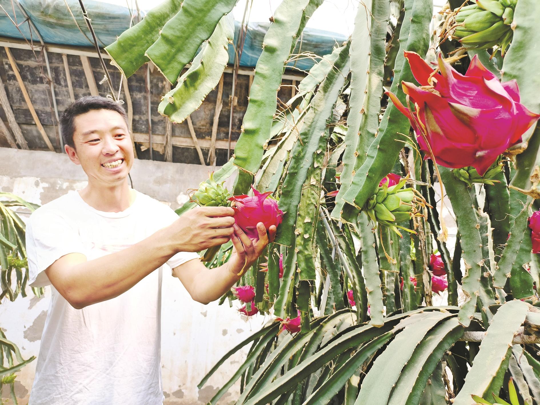 初冬时节,我市三区温室大棚种植的反季节特色农产品喜迎丰收,陆续上市。图为海勃湾区千里山镇王元地村种植户在温室大棚内采摘火龙果。