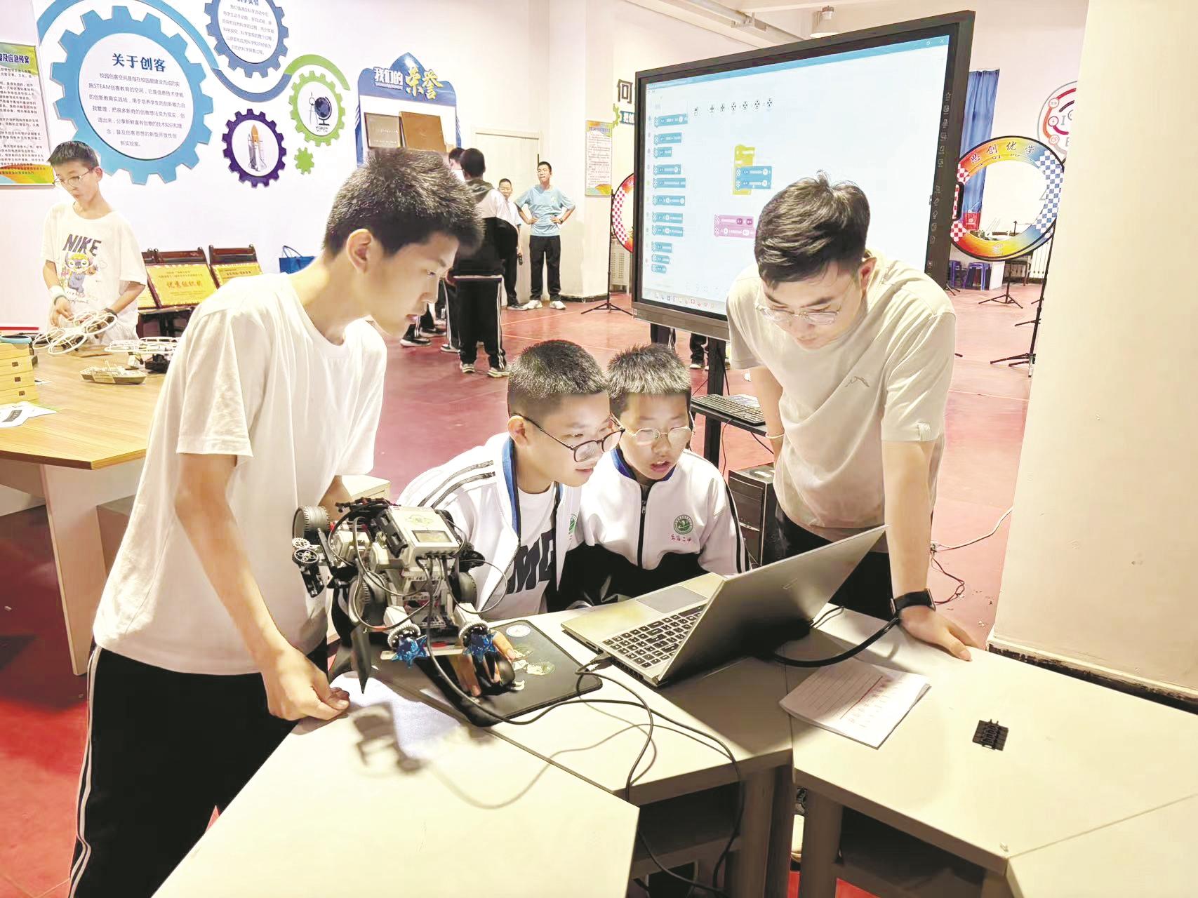 市第二中学机器人社团的老师指导学生编程。(赵政宇 摄)
