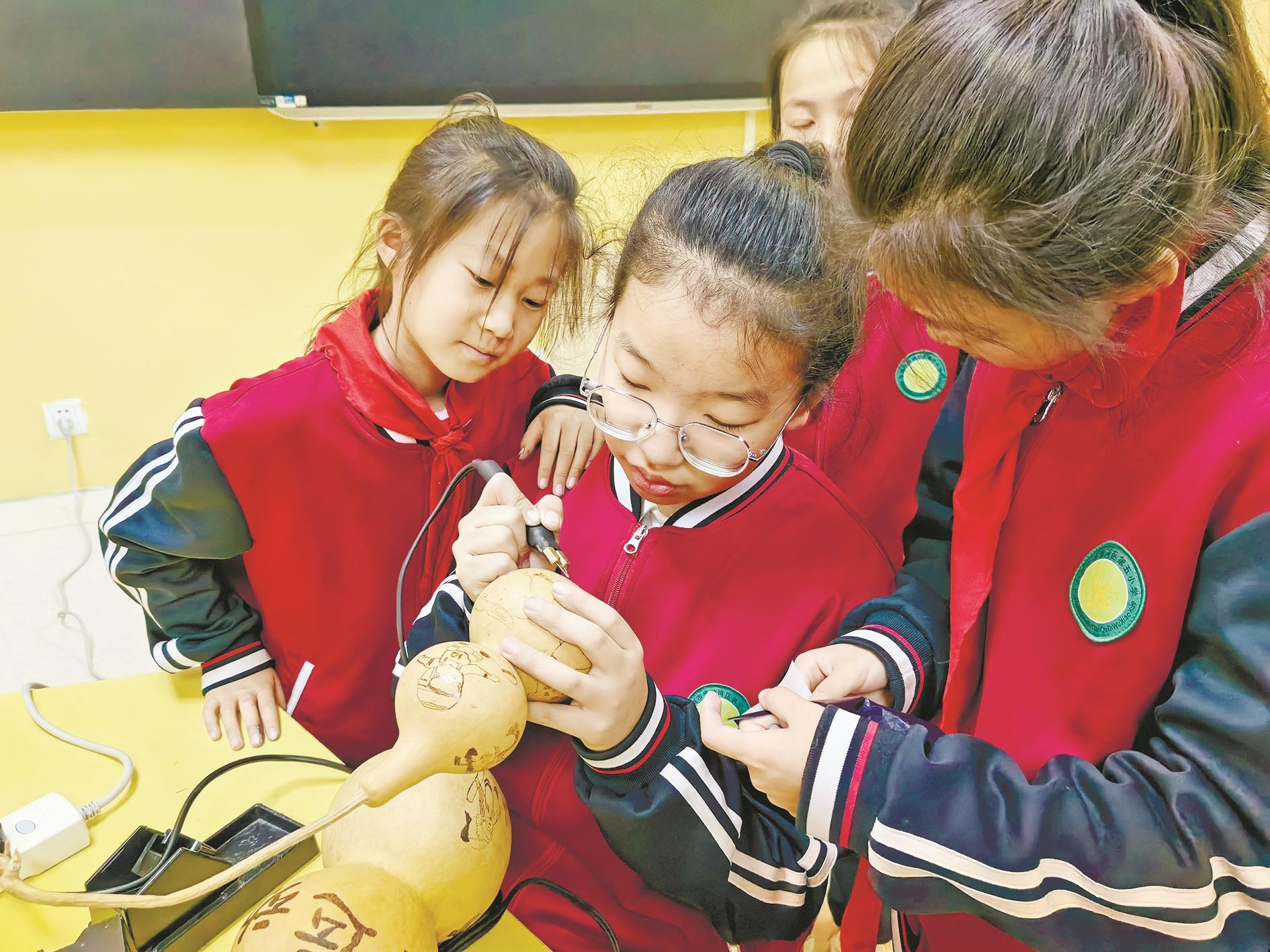 海勃湾区第五小学龙游湾校区学生学习烫画。(郑彩虹 摄)