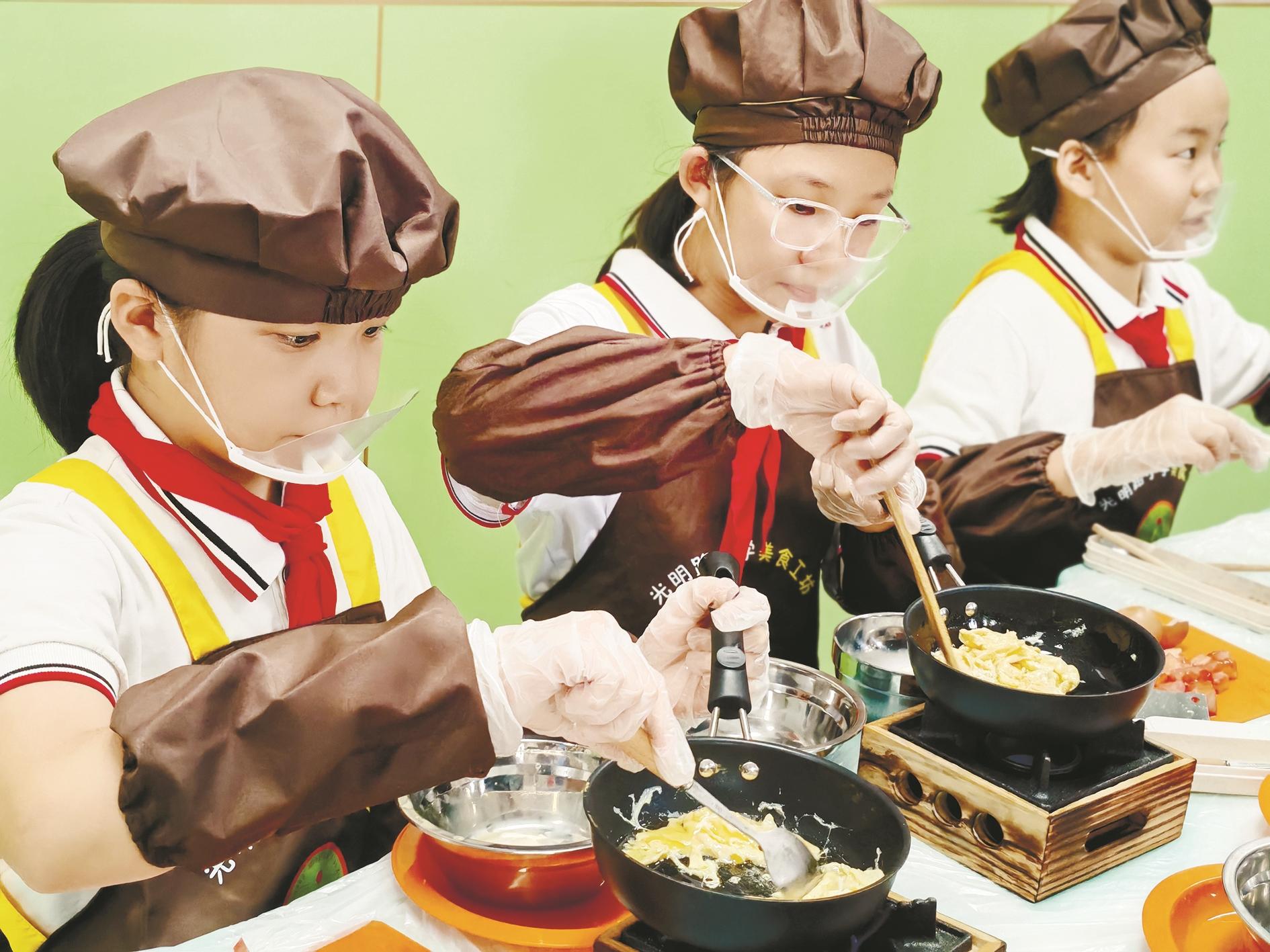 海勃湾区光明路小学学生正在上厨艺课。(郑彩虹 摄)