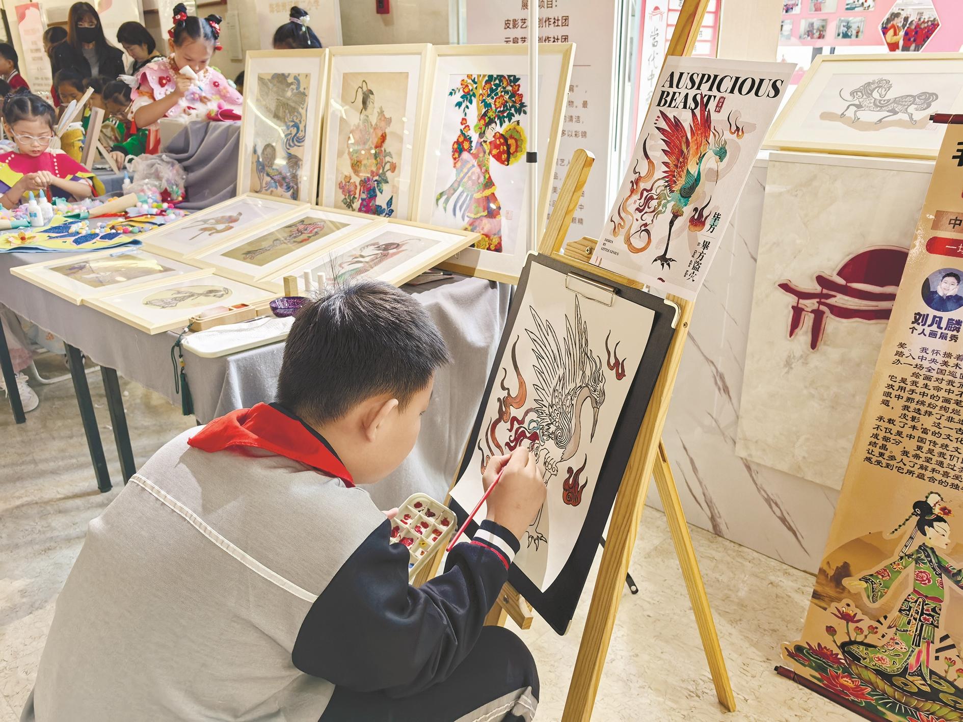 海勃湾区第一小学皮影社团学生正在进行皮影艺术创作。(郑彩虹 摄)
