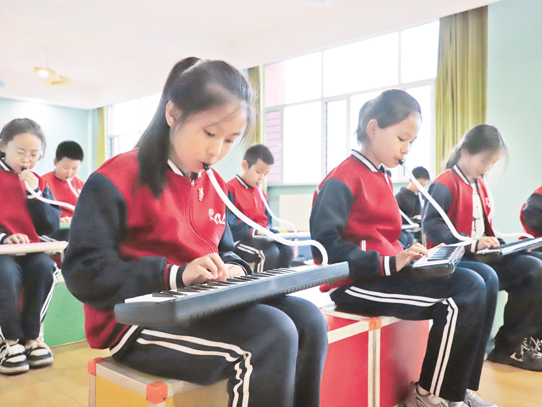 乌达区胜利街小学口风琴社团的学生正在演奏。(赵政宇 摄)