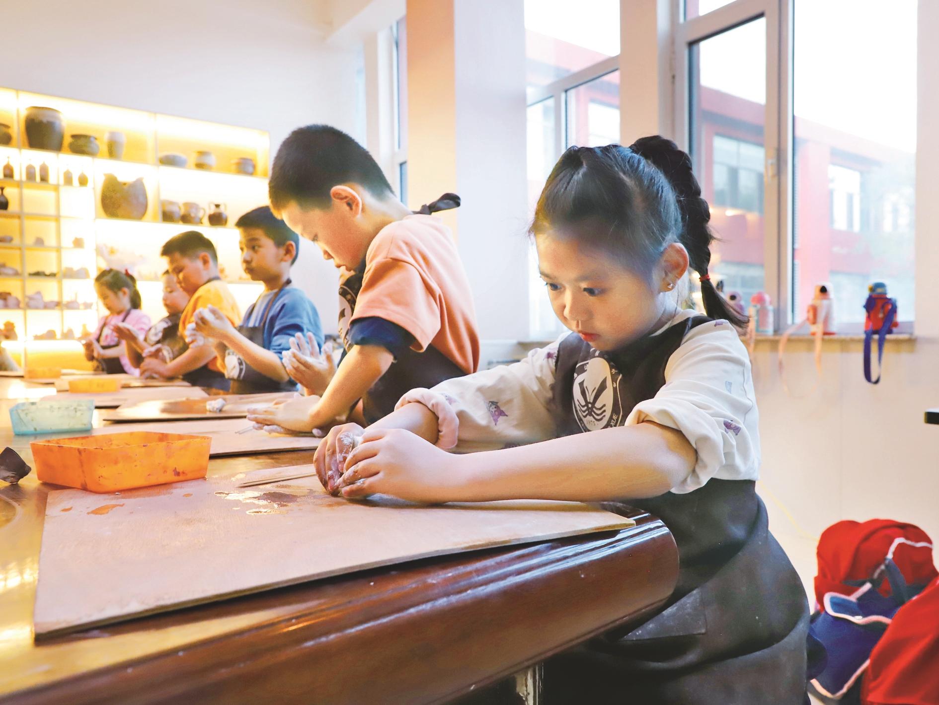 乌达区胜利街小学陶艺社团的学生专心制作陶艺。(赵政宇 摄)