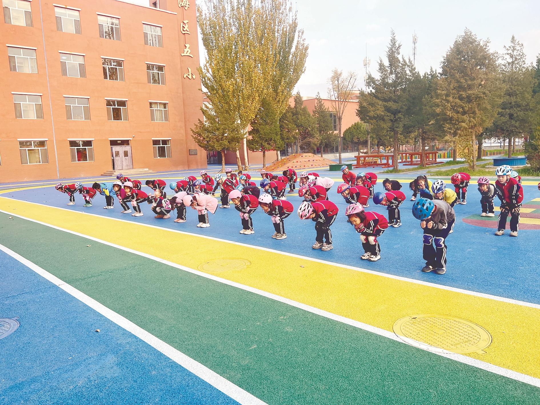 海勃湾区第五小学龙游湾校区学生学习轮滑。(郑彩虹 摄)