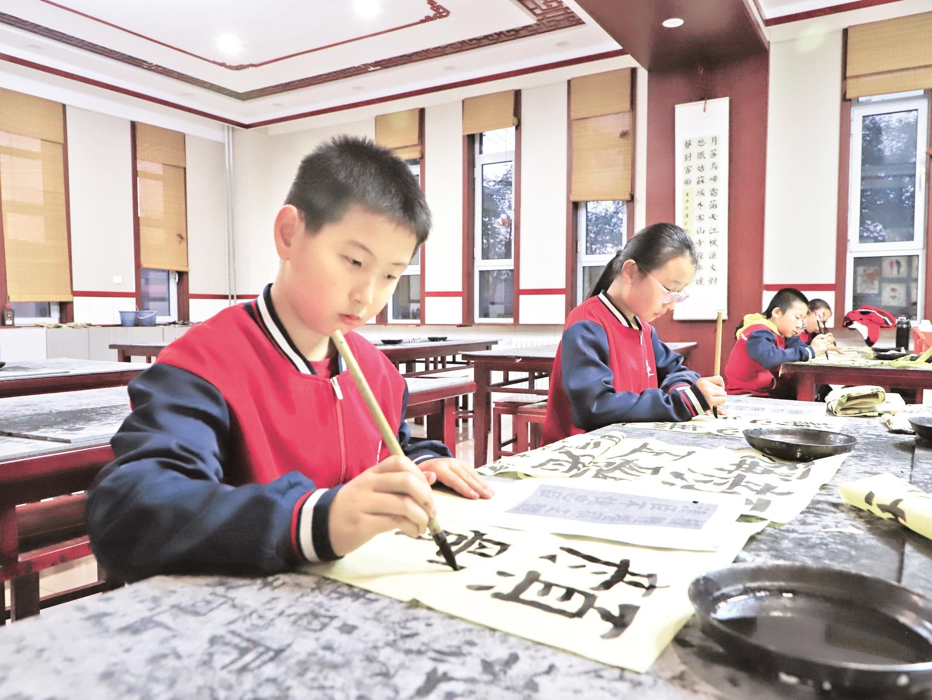 乌达区胜利街小学书法社团的学生学习书法。(赵政宇 摄)