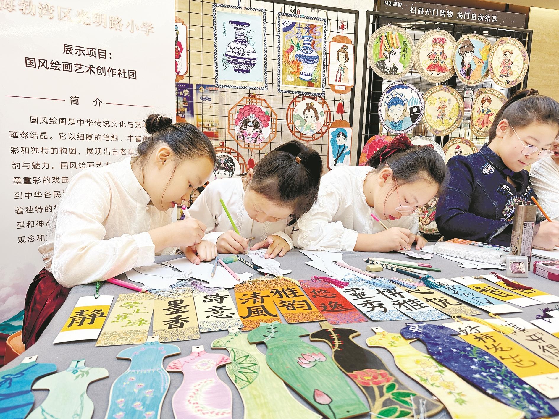 海勃湾区光明路小学国风绘画艺术创作社团的学生制作国风书签。(郑彩虹 摄)