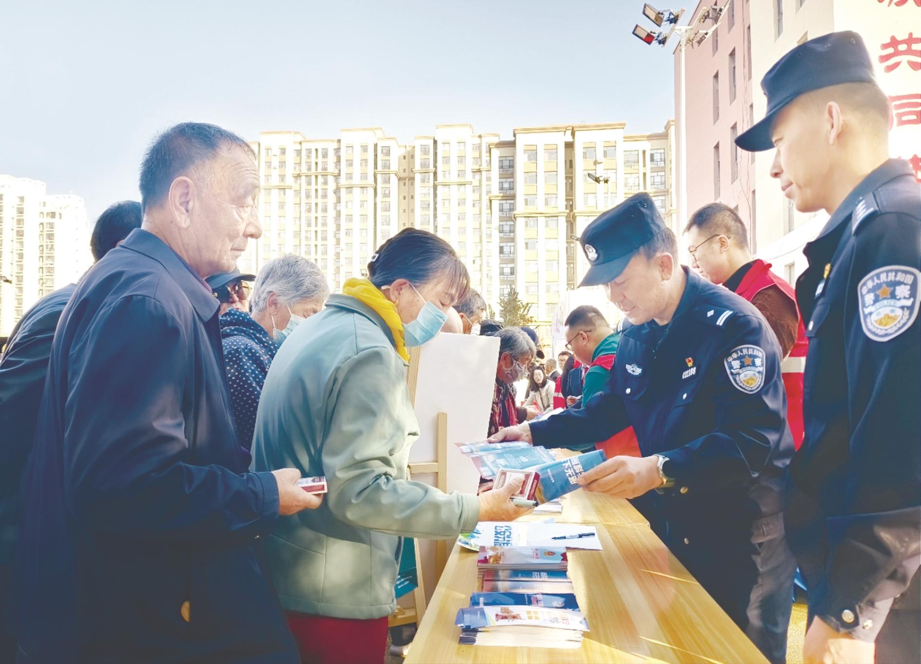 近日,我市政法系统开展“法治集市”活动,政法干警向群众进行普法宣传,涵盖扫黑除恶、反邪教、反诈骗、防范非法集资等与群众生活密切相关的法治知识,并解答群众法律咨询。图为市公安局海勃湾分局民警向群众讲解邪教组织的危害。 (曹艺 摄)
